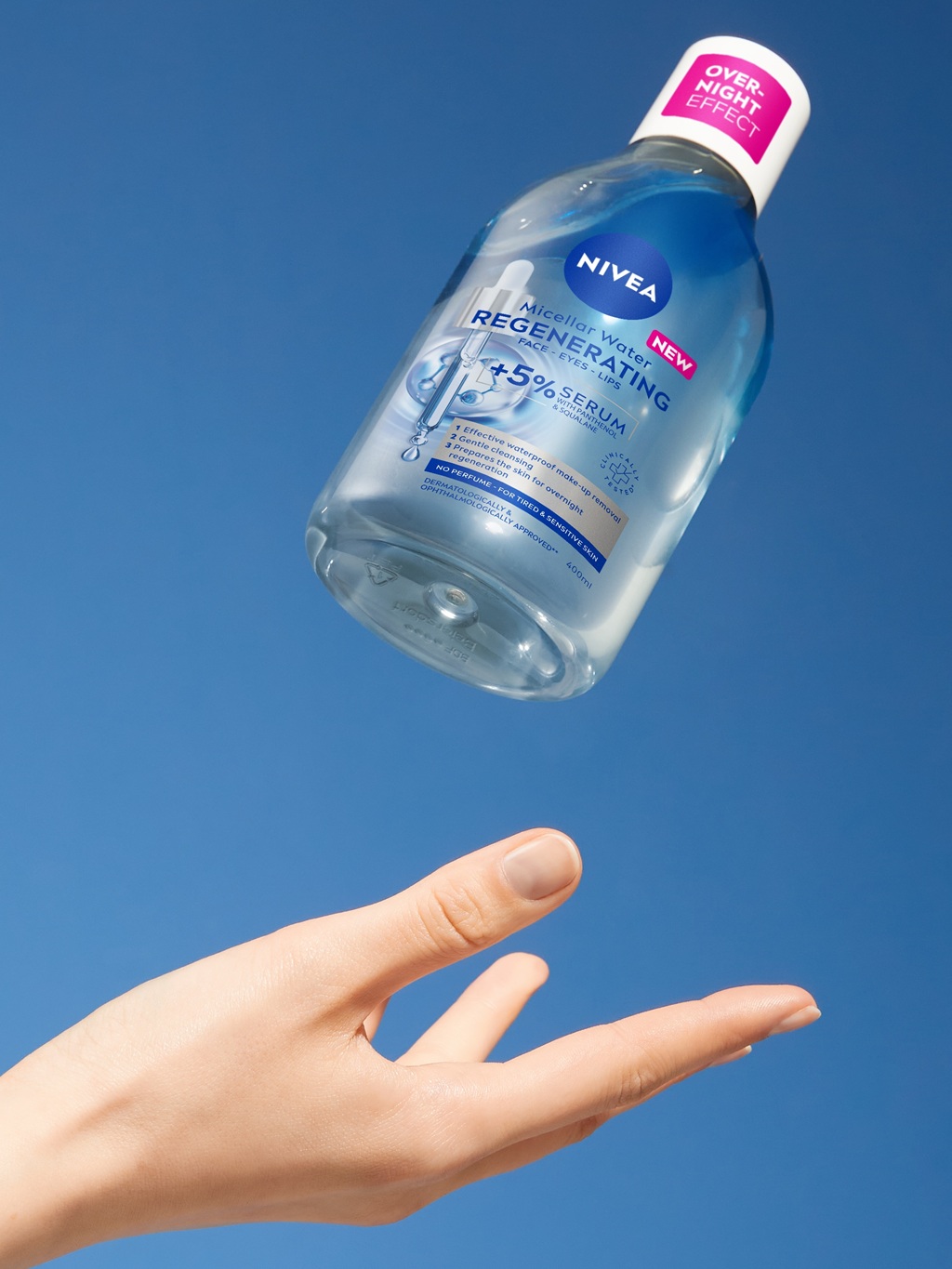 Den innovativa formulan i NIVEA Regenerating Serum Infused Micellar Water innehåller 5 % serum med panthenol, skvalan och ett aminosyrakomplex. Den är utformad för att rengöra samtidigt som den återställer fukt och främjar hudens återhämtning. Formulan är dermatologiskt och oftalmologiskt testad för hud- och ögonkompatibilitet, lämnar ingen oljig hinna och ger en utvilad hudeffekt på morgonen.