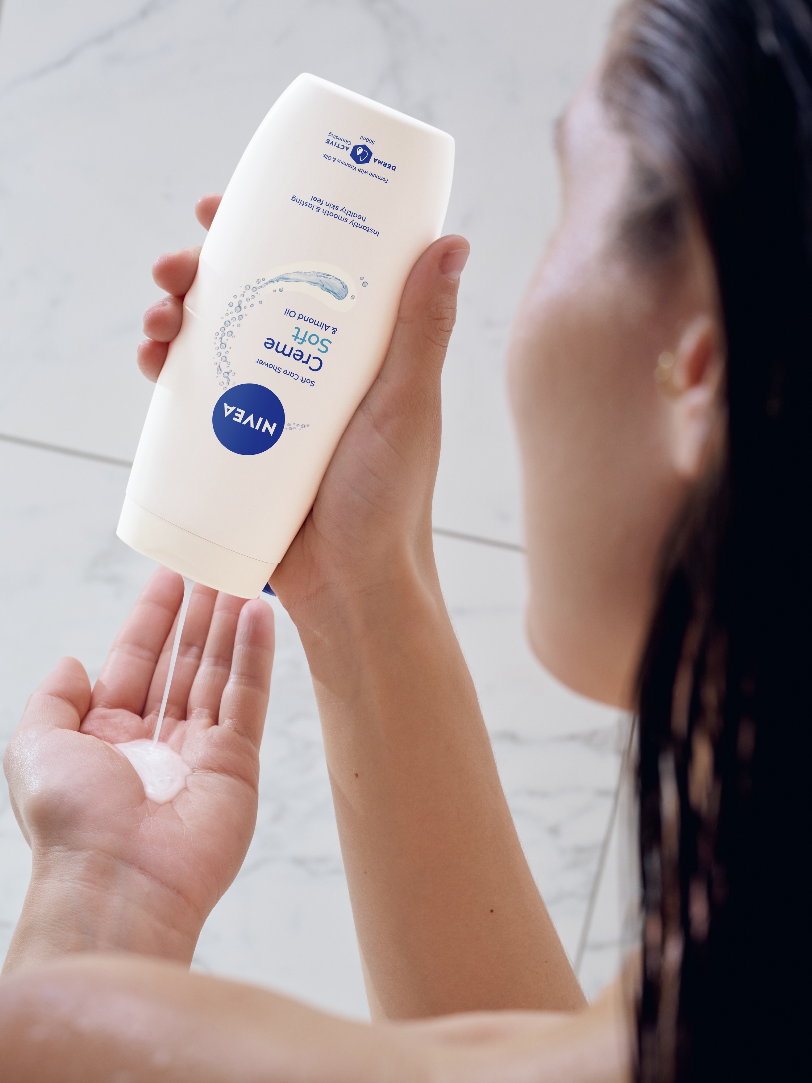 Börja din hudvårdsrutin med en uppfriskande dusch och se till att huden blir ordentligt blöt. Applicera sedan NIVEA Creme Soft Shower Gel generöst på hela kroppen med ljummet vatten. Gelens unika formula kombinerar fördelarna med vitamin C och E för att förhindra att huden torkar ut och lämnar den näringsrik och vitaliserad.