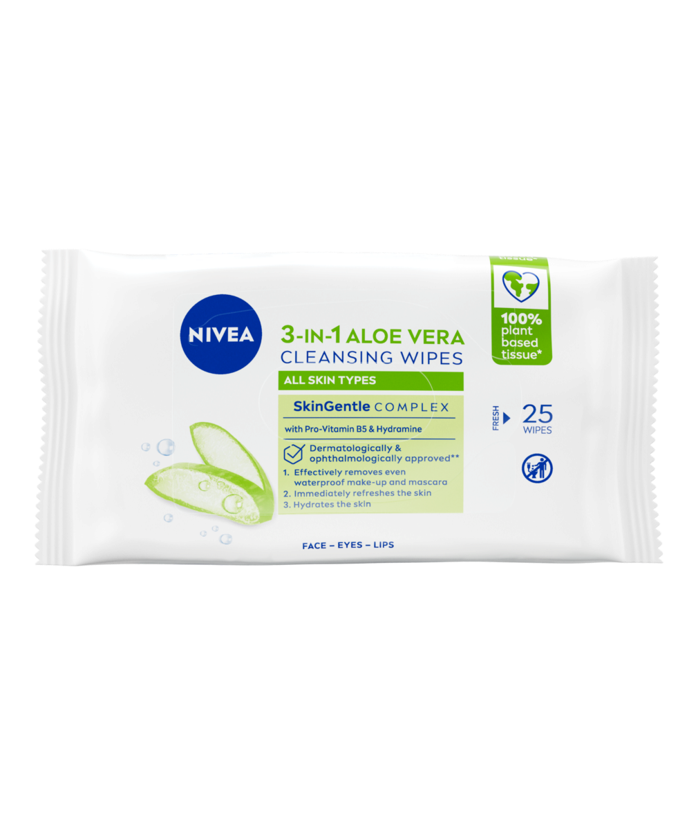Aloe Vera Cleansing Wipes: uppfriskande växtbaserade rengöringsservetter med SkinGentle-komplex som är snälla mot huden och skyddar dess fuktbalans. Tar effektivt och skonsamt bort vattenfast make-up och mascara | 25 st