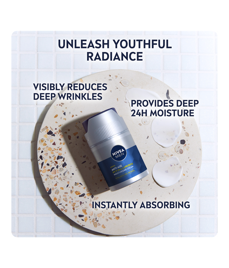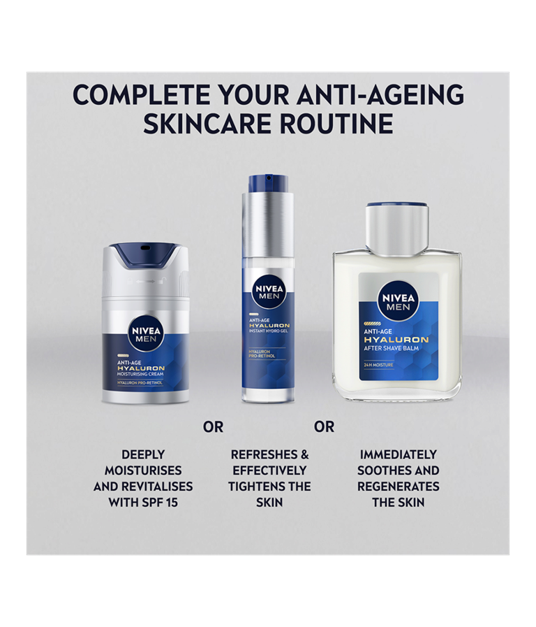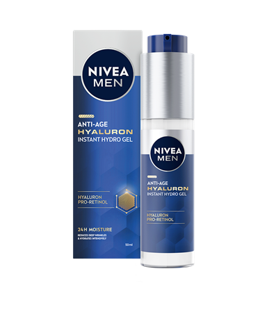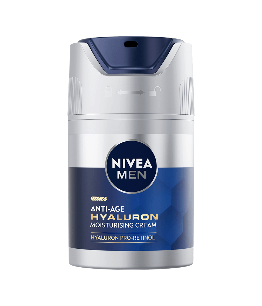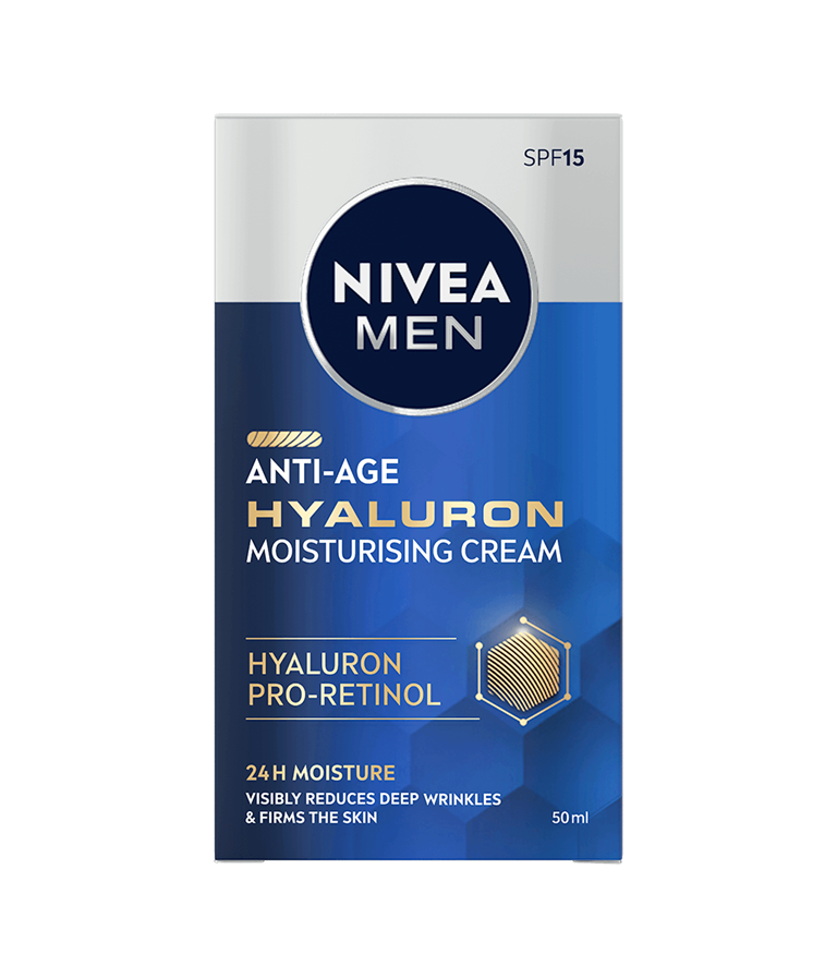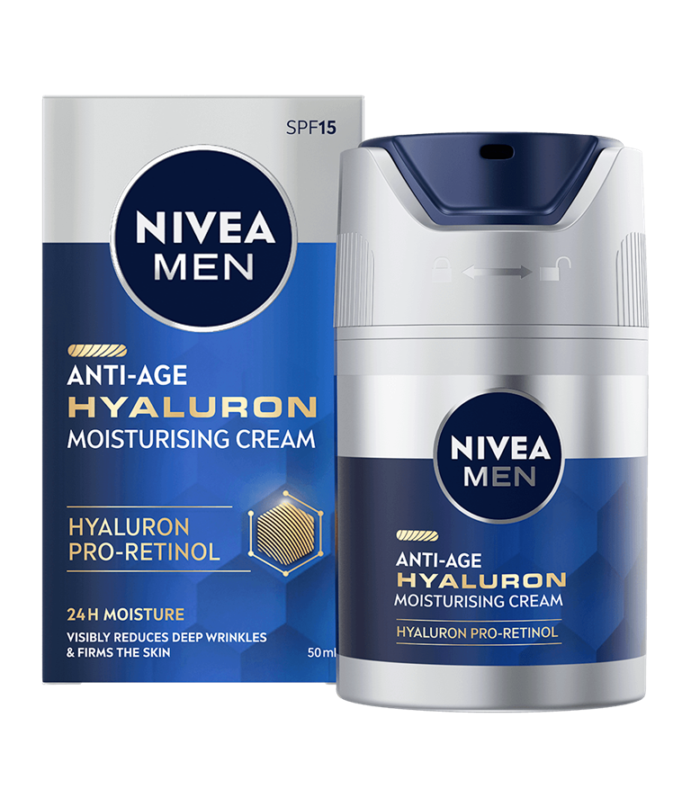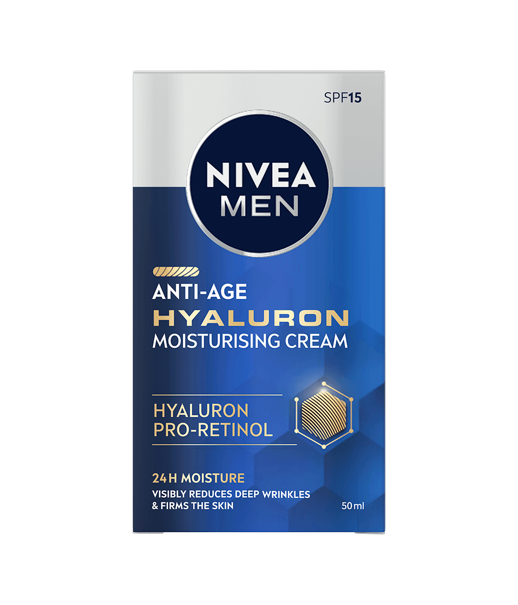 NIVEA MEN Anti Age Hyaluron Face Cream är en ansiktskräm med cellaktiverande Anti-Age-effekt med HYALURON och PRO-RETINOL som synligt minskar rynkor och gör huden fastare. Formulan är berikad med SPF 15.