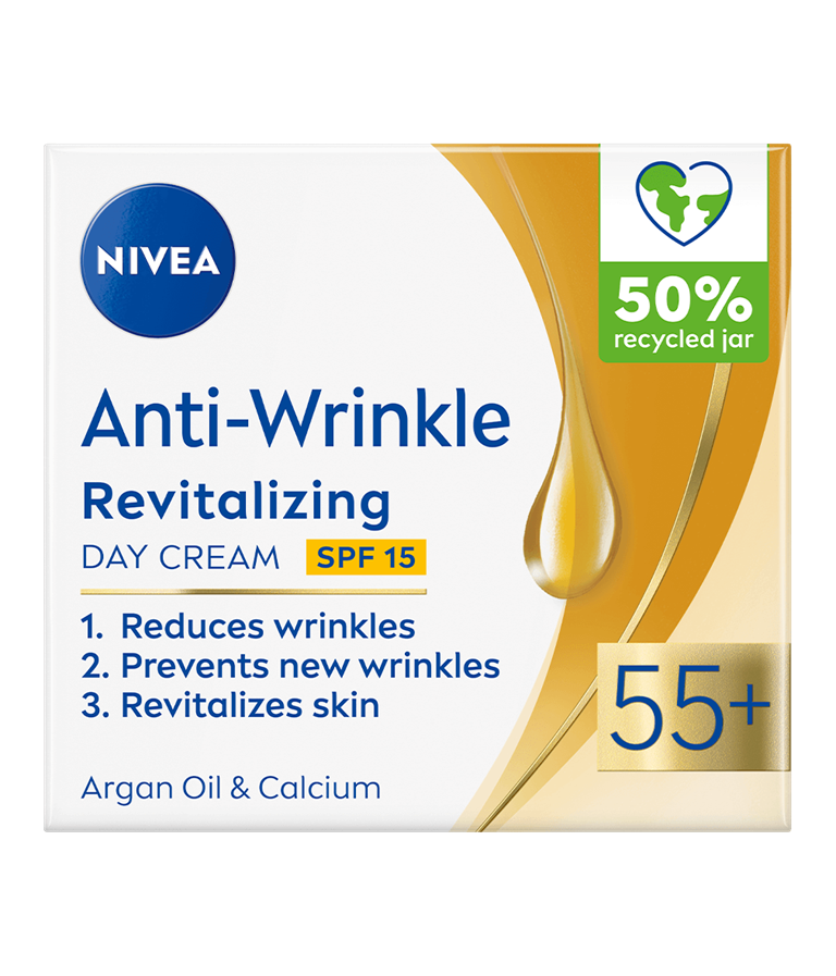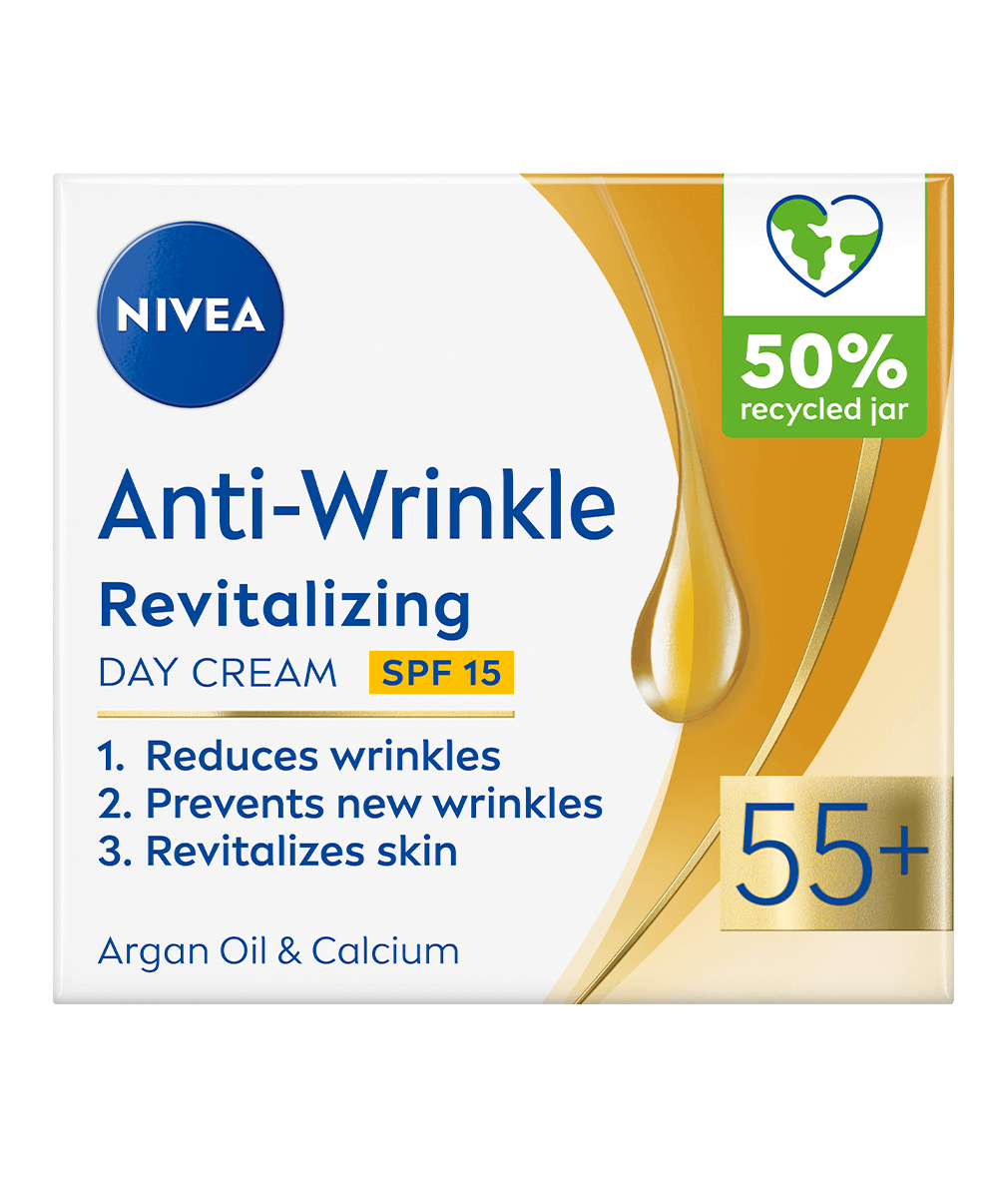 NIVEA Anti-Wrinkle Plus Revitalizing Day Cream är en dagkräm med SPF 15 som motverkar rynkor och har en formula som innehåller arganolja och kalcium. Innehåller också UV-filter, SPF 15-extra skydd mot åldrande hud. Passar för daglig användning.