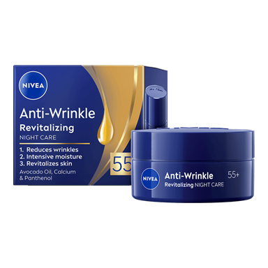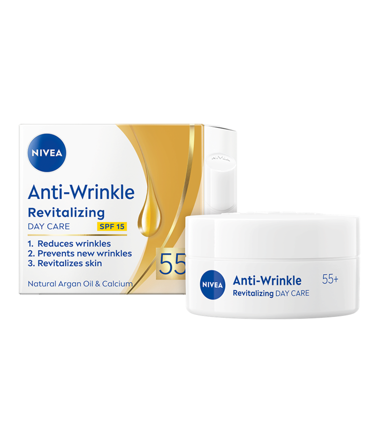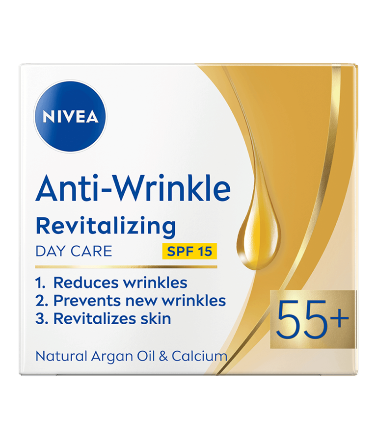 NIVEA Anti-Wrinkle Revitalizing 55+ Day Cream är en dagkräm med SPF 15 som motverkar rynkor och har en formula som innehåller arganolja och kalcium. Innehåller också UV-filter, SPF 15- skydd mot solens strålar. Passar för daglig användning.