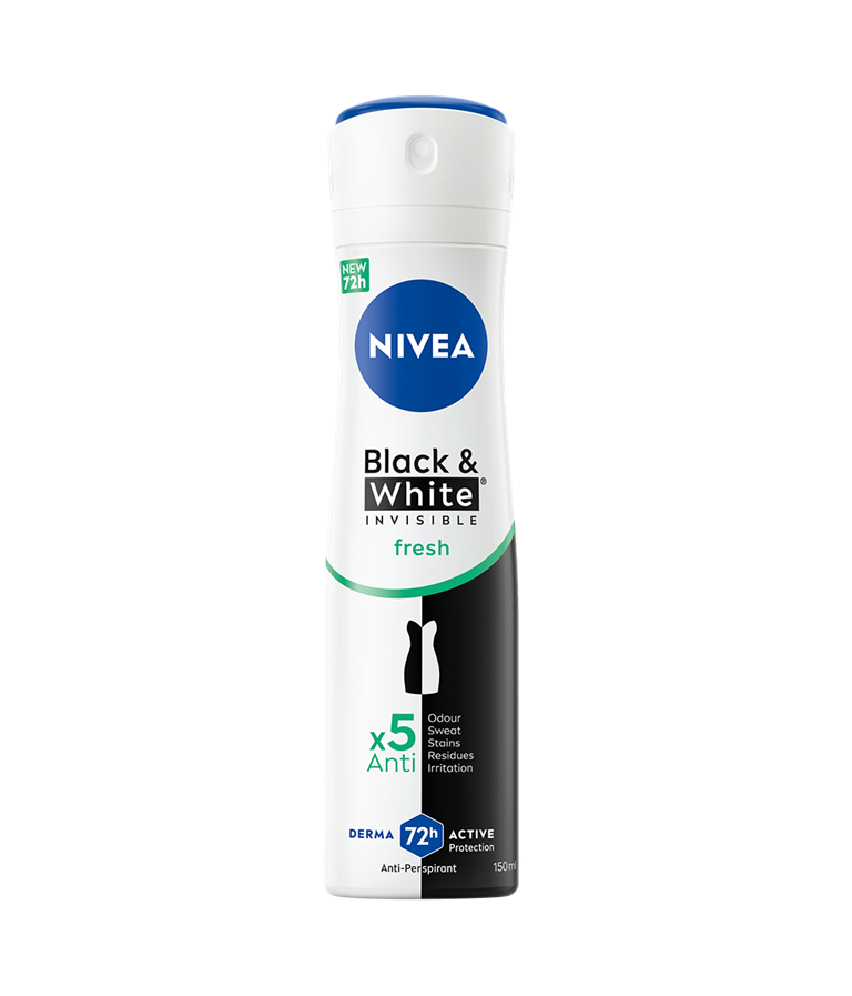 NIVEA Black & White Fresh Spray är en antiperspirant spray som förhindrar vita fläckar på mörka kläder och gula fläckar på ljusa kläder. Den ger ett effektivt skydd mot svett och lukt i 72h samtidigt som den är snäll mot din hud.