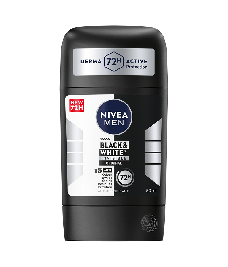 NIVEA MEN Black & White Original Stick ger skydd mot vita fläckar på svarta kläder och mot gula fläckar på vita kläder tack vare den unika patenterade anti-stain teknologi. Det är ett pålitligt 72 timmars antiperspirantskydd, effektiv mot svett och lukt, som tar hand om din hud.