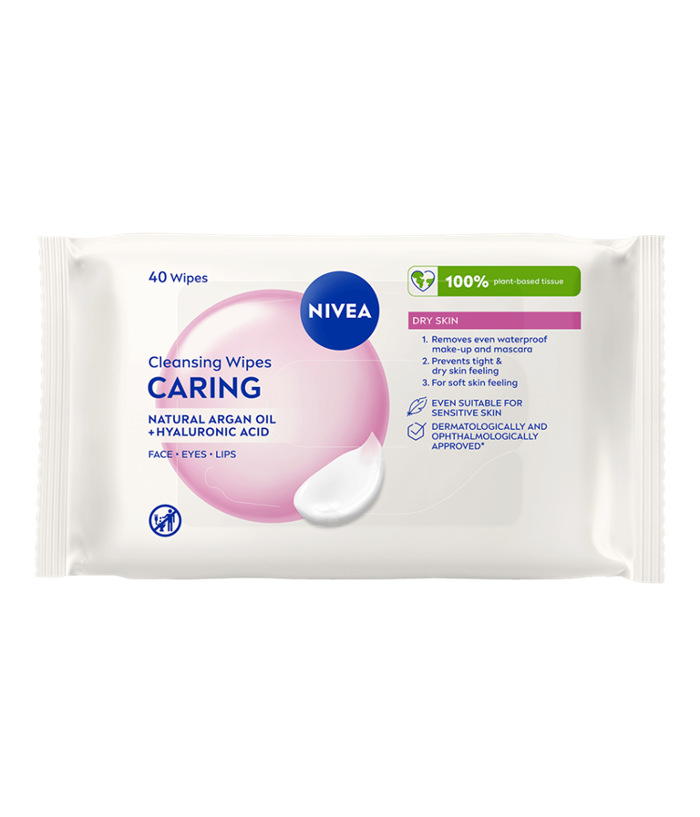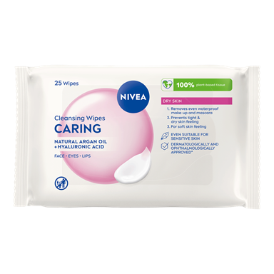 NIVEA Caring Cleansing Wipes är vårdande rengöringsservetter med växtbaserade ingredienser. Den närande formulan är berikad med naturlig arganolja och hyaluronsyra, vilket hjälper till att bevara hudens fuktbalans. Servetterna avlägsnar effektivt även vattenfast smink och mascara, och lämnar huden mjuk och välvårdad.