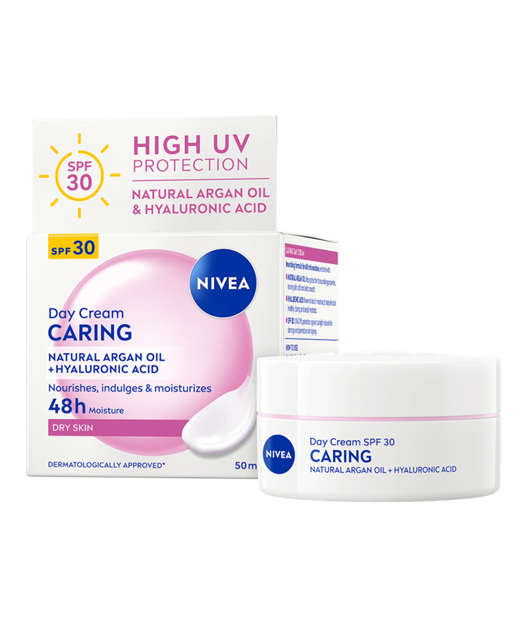 NIVEA CARING DAY CREAM SPF30 är en dagkräm utvecklad för torr hud. Med sin silkeslena formula smälter den in i huden utan ansträngning och återfuktar på djupet för en mjuk och elastisk hudkänsla. Dessutom innehåller den SPF 30 som skyddar huden mot solens skadliga strålar.