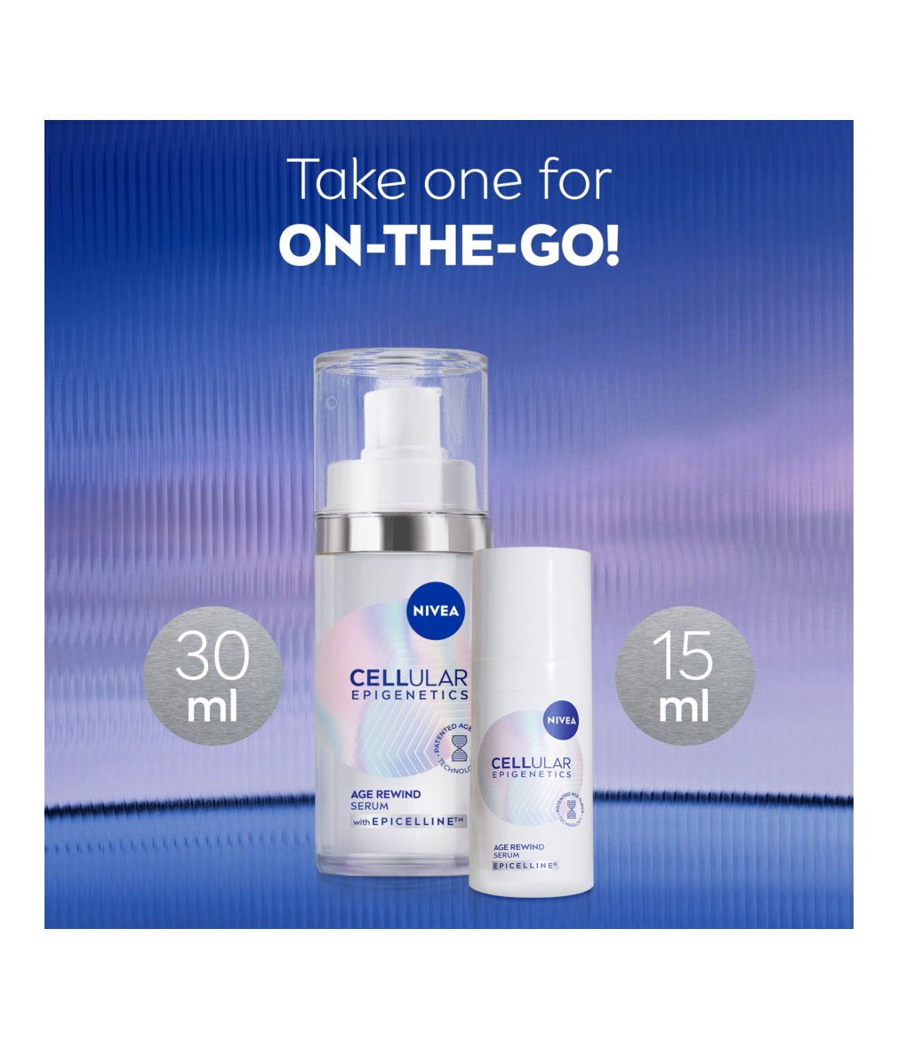 NIVEA Cellular Epigenetics Age Rewind serum, med sin patenterade Age Clock Technology® och kraftfulla ingrediensen Epicelline®, ger dig synliga resultat på bara två veckor (in vitro).