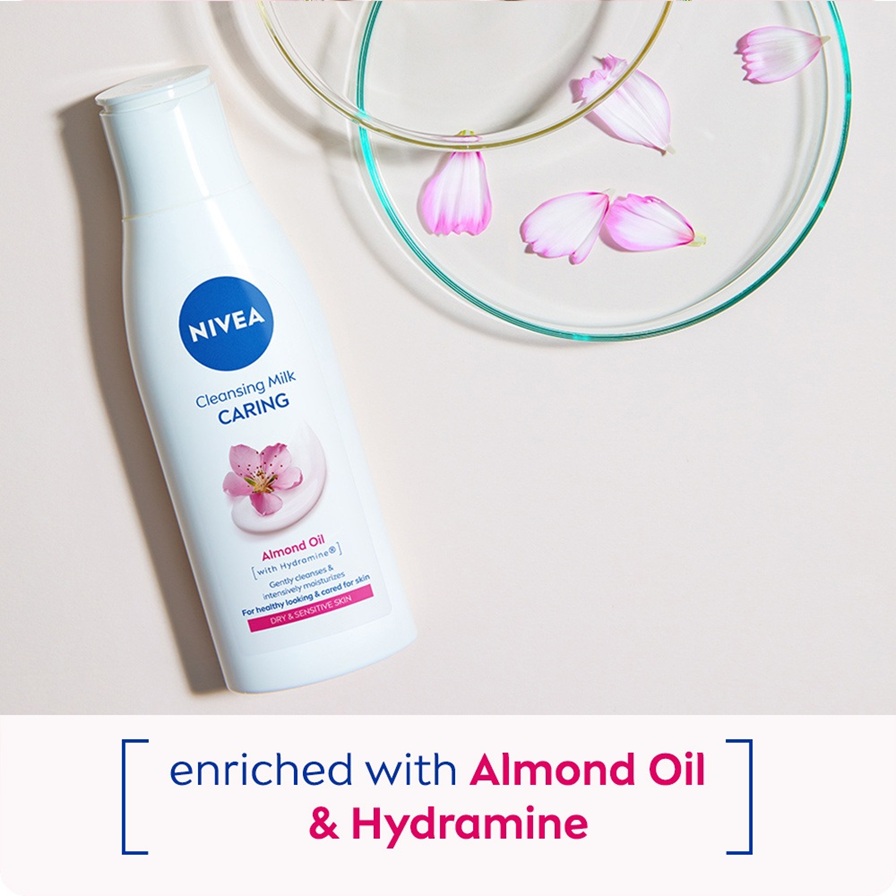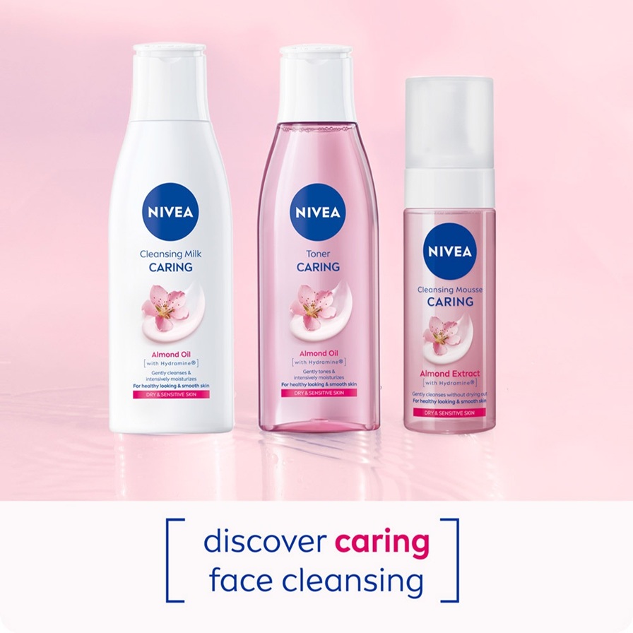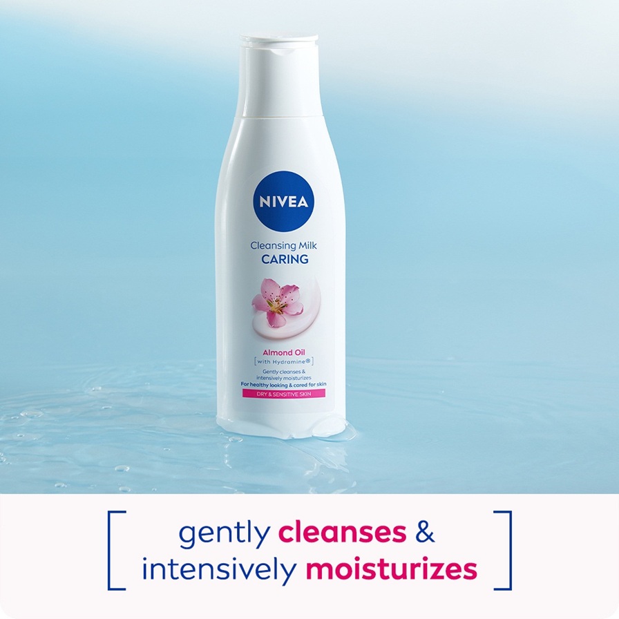 NIVEA Cleansing Milk Caring är en rengöringsmjölk som är berikad med Mandelolja och hydramine. Den tar inte bara bort smink, utan återfuktar, lugnar och vårdar huden intensivt. Speciellt anpassad för torr hud.