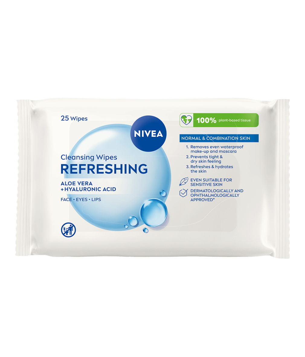 NIVEA Refreshing Cleansing Wipes är 100% växtbaserade servetter som tack vare sin uppfriskande formula berikad med aloe vera och hyaluronsyra rengör varsamt samtidigt som de hjälper till att bibehålla hudens fuktbalans. De avlägsnar effektivt även vattenfast smink och mascara och lämnar huden återfuktad och uppfriskad.