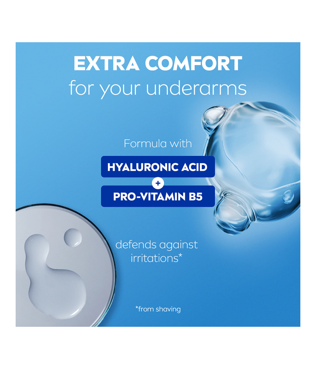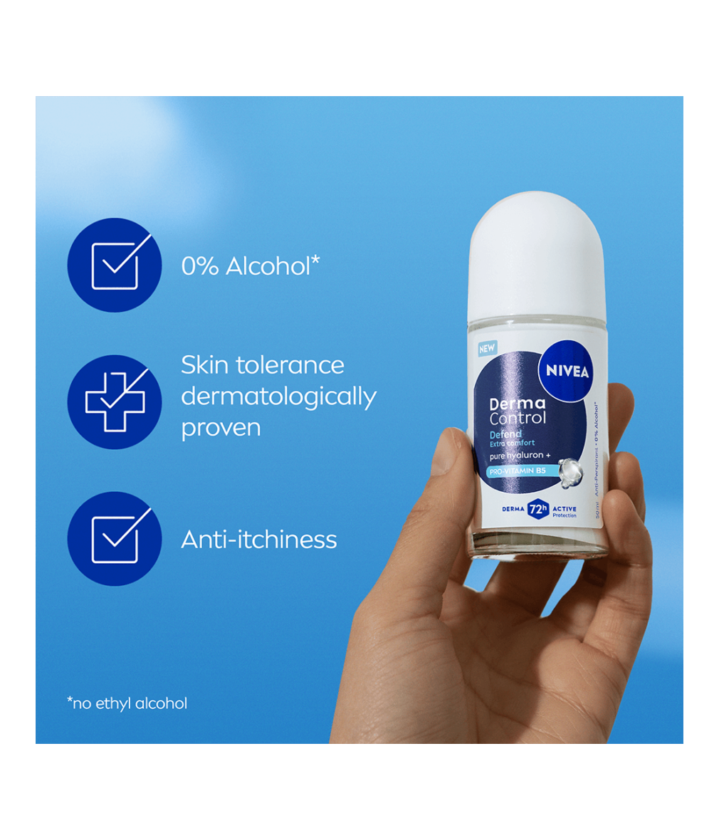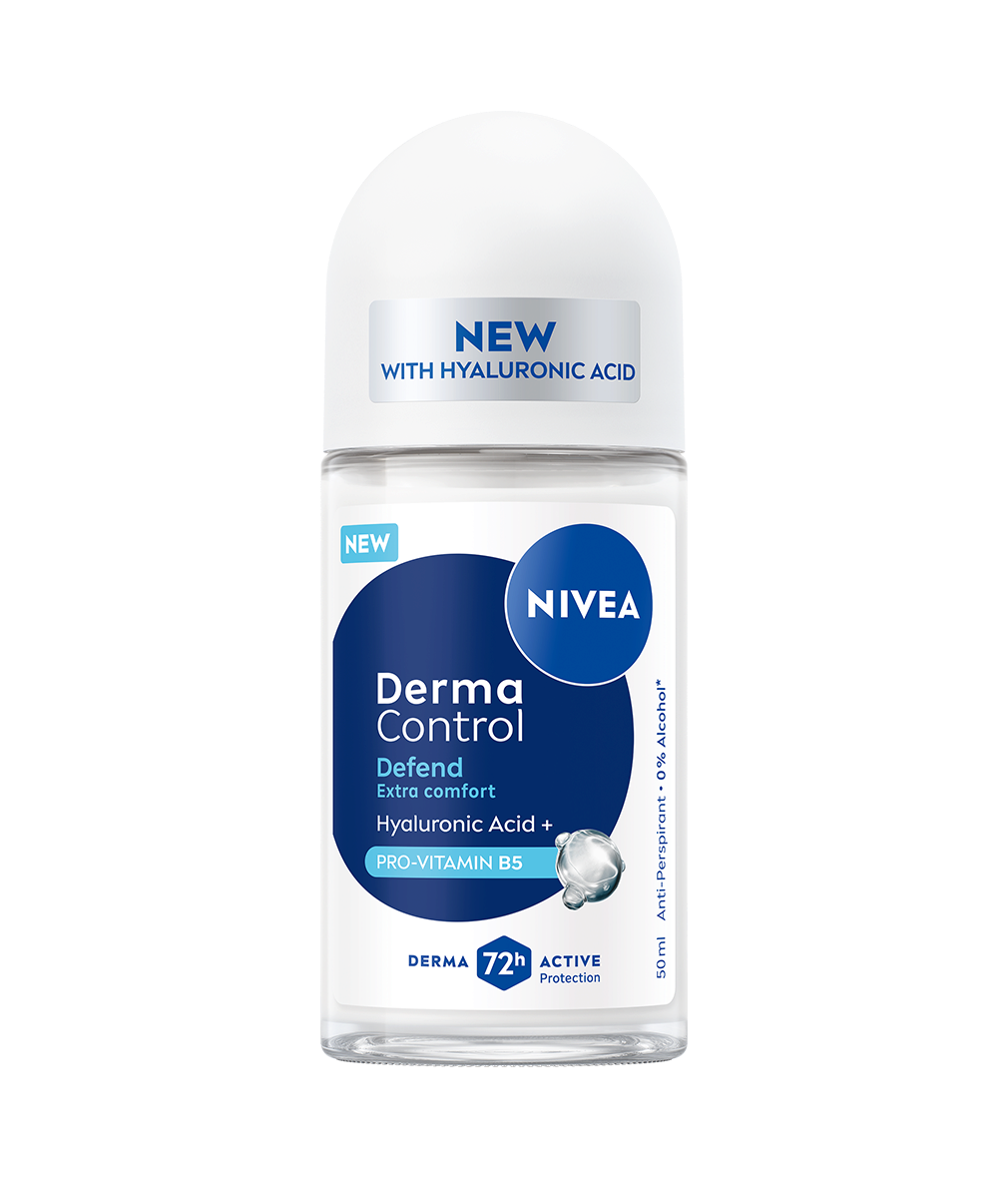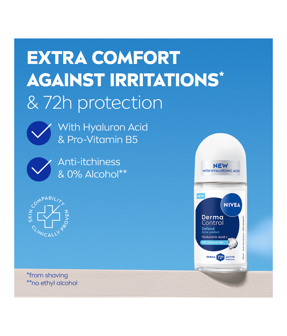 NIVEA Derma Control Defend-serien, med Hyaluronsyra och Pro-Vitamin B5, skyddar din hud mot irritationer från rakning. Denna anti-perspirant erbjuder 72 timmars svett- och luktsskydd samtidigt som de gör dina armhålor mjukare och ger en behaglig känsla på huden.