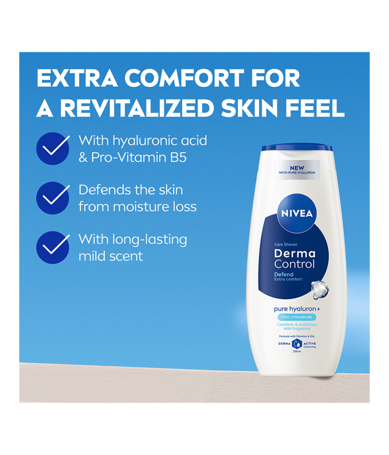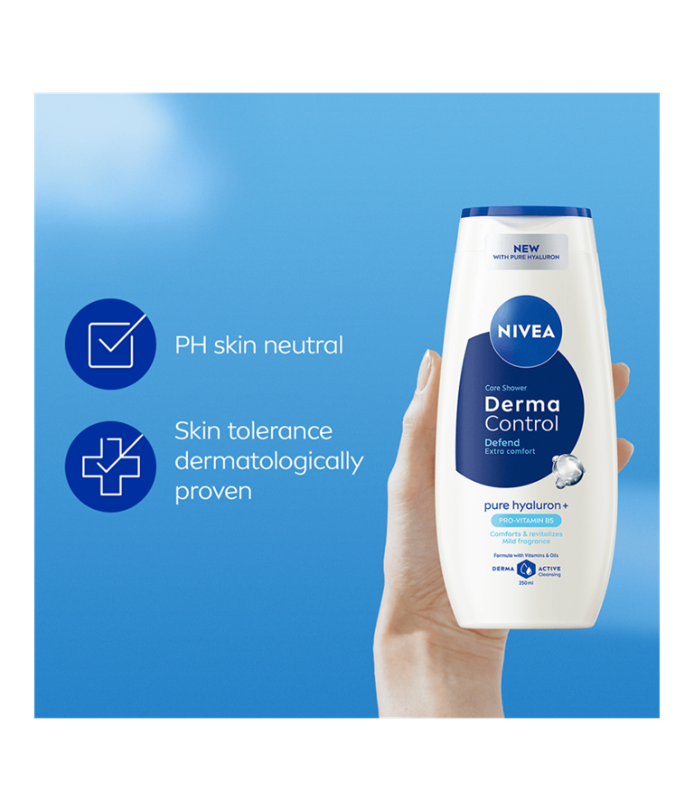 NIVEA Derma Control Defend Shower, med Hyaluronsyra och Pro-Vitamin B5, rengör din hud skonsamt. Dess formula rengör huden och stöttar dess motståndskraft mot irritation och torrhet. Med sina vårdande ingredienser hjälper den till att bevara hudens naturliga fuktbalans.