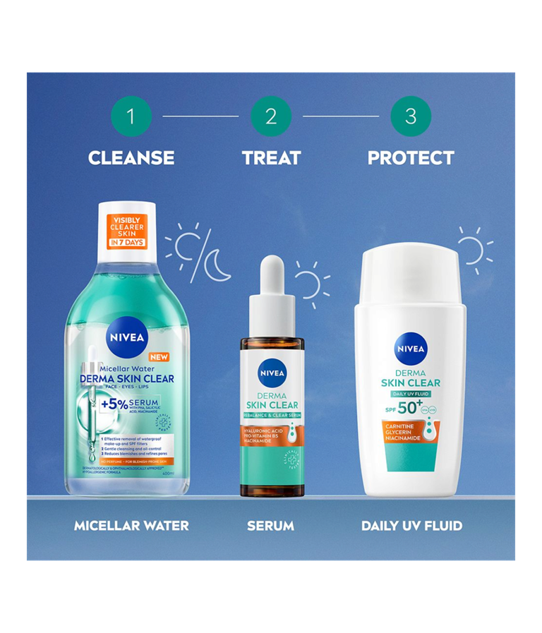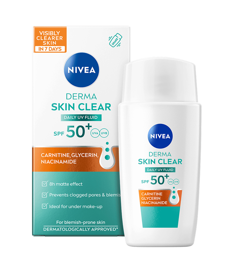 Börja din resa mot välmående hud med NIVEA Derma Skin Clear Daily UV Fluid. Formulan med Karnosin, Glycerin och Niacinamid är speciellt framtagen för aknebenägen hud och är perfekt under smink. Ger 8 timmars nedmattad hud och förhindrar tilltäppta porer och blemmor.