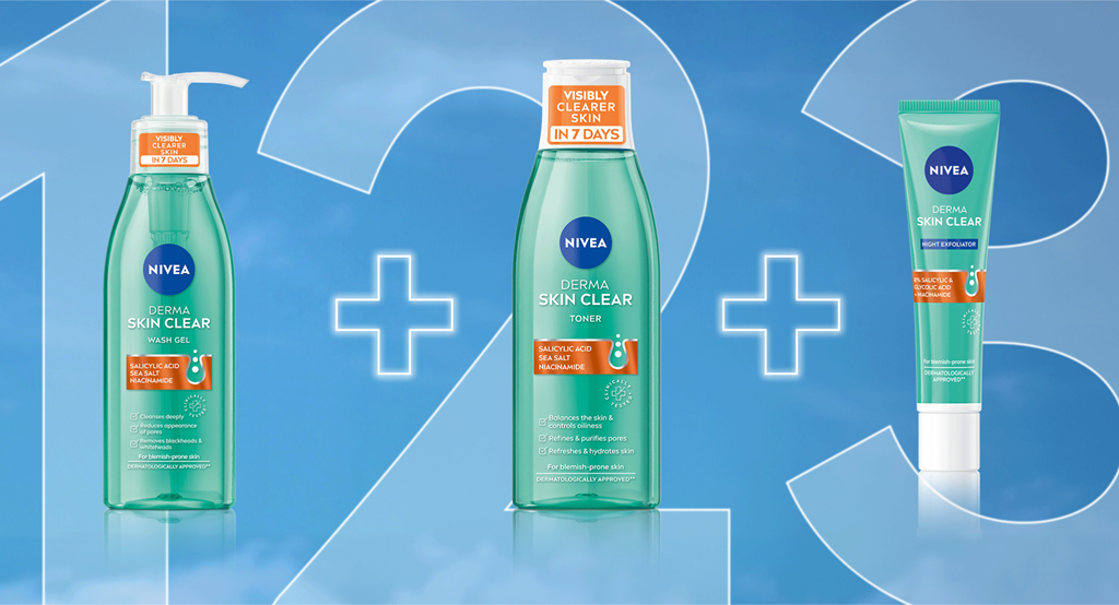 Start your day with NIVEA Derma Skin Clear Wash Gel and NIVEA Derma Skin Clear Toner to help cleanse your skin, refine pores and control oiliness. Then use NIVEA Derma Skin Clear Rebalance & Clear Serum, a hydrating facial serum that soothes your skin and strengthens the skin barrier. Experience improved skin with this non-drying morning blemish-fighting routine.