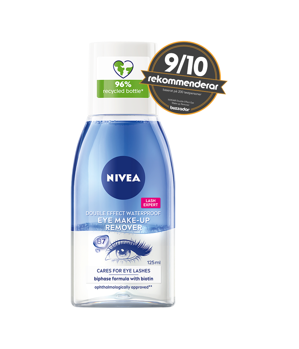 Double Effect Eye Make-up Remover är berikad med Biotin och löser upp även mycket vattenfast mascara utan att du behöver gnugga. Makeup remover är skonsam för ögonfransarna. Vegansk formula – fri från animaliska ingredienser.