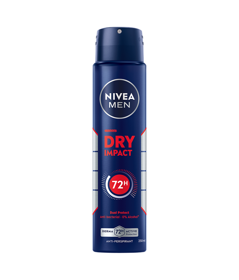 NIVEA Dry Impact Spray Anti-Perspirant är en spraydeo som ger dig 72 timmars skydd. Den effektiva dubbelverkande formulan med två aktiva antibakteriella ämnen hjälper dig att hålla dig torr från svett och förhindrar dålig lukt. Skonsam mot din hud.