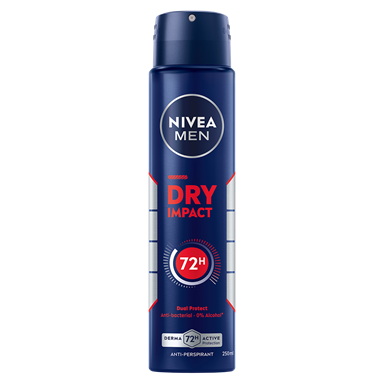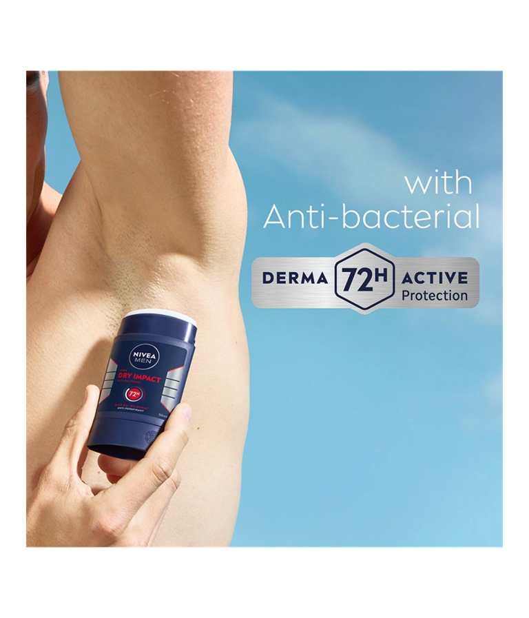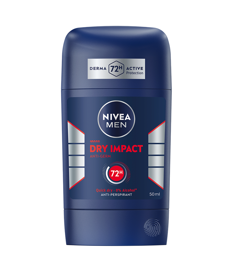 NIVEA MEN Dry Impact Stick är en Anti-Perspirant som ger 72 timmars effektivt skydd mot svett och lukt samtidigt som den tar hand om din hud. Med sin dubbelverkande formula med 2 antiperspirantaktiva ämnen håller denna deodorant dig torr hela dagen, dessutom innehåller den ingen etylalkohol vilket gör den skonsam för din hud.