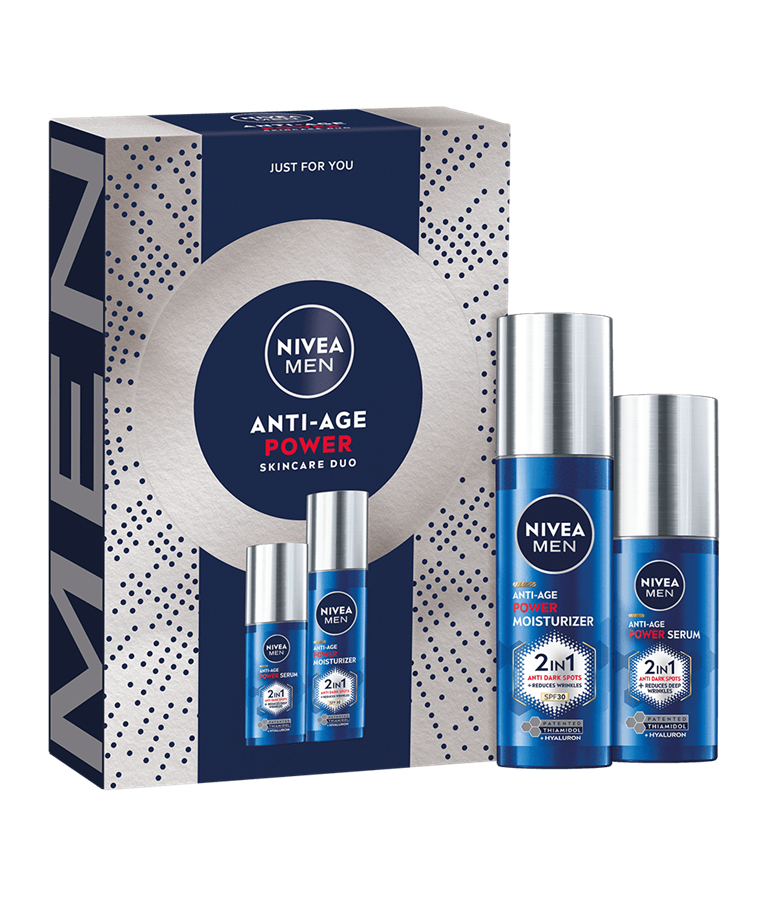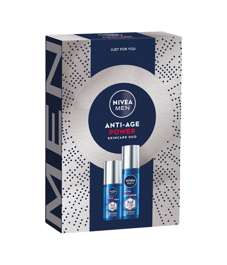 NIVEA MEN Giftpack Anti-Age Power är utformat för att minska ålderstecken. Det innehåller NIVEA MEN Anti-Age 2in1 Power Moisturiser SPF 30 för återfuktning och solskydd, samt NIVEA MEN Anti-Age 2in1 Power Serum för ökad hudföryngring. Perfekt för män som söker uppfräschad och revitaliserad hud.