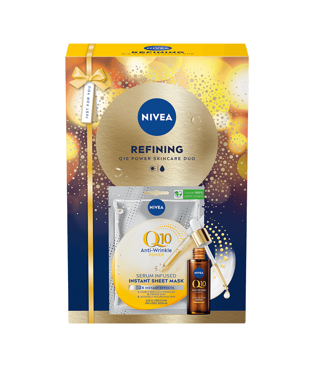 Giftpack Refining är utformat för att minska ålderstecken med sitt kraftfulla Q10 Anti-Wrinkle Expert Dual Action Serum och den återfuktande Q10 Anti-Wrinkle Power Sheet Mask. Upplev strålande hud idag.