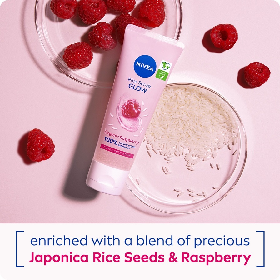 NIVEA Rice Scrub Glow är en ansiktsskrubb som är berikad med ekologiskt framställda Japonica-risfrön och hallon. Denna exfoliering exfolierar skonsamt och tar effektivt bort döda hudceller utan att irritera huden.