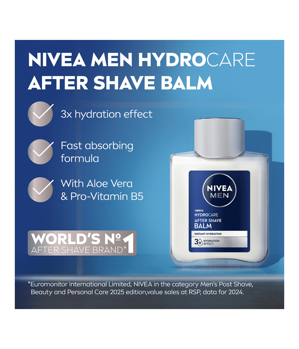 NIVEA MEN Hydrocare After Shave Balm är ett rakbalsam som återfuktar omedelbart och skyddar din hud från att torka ut. Krämen har en mild, kladdfri formula berikad med Alo Vera och Provitamin B5 som omedelbart lugnar obehag i huden och ger en långvarig och intensiv återfuktning.