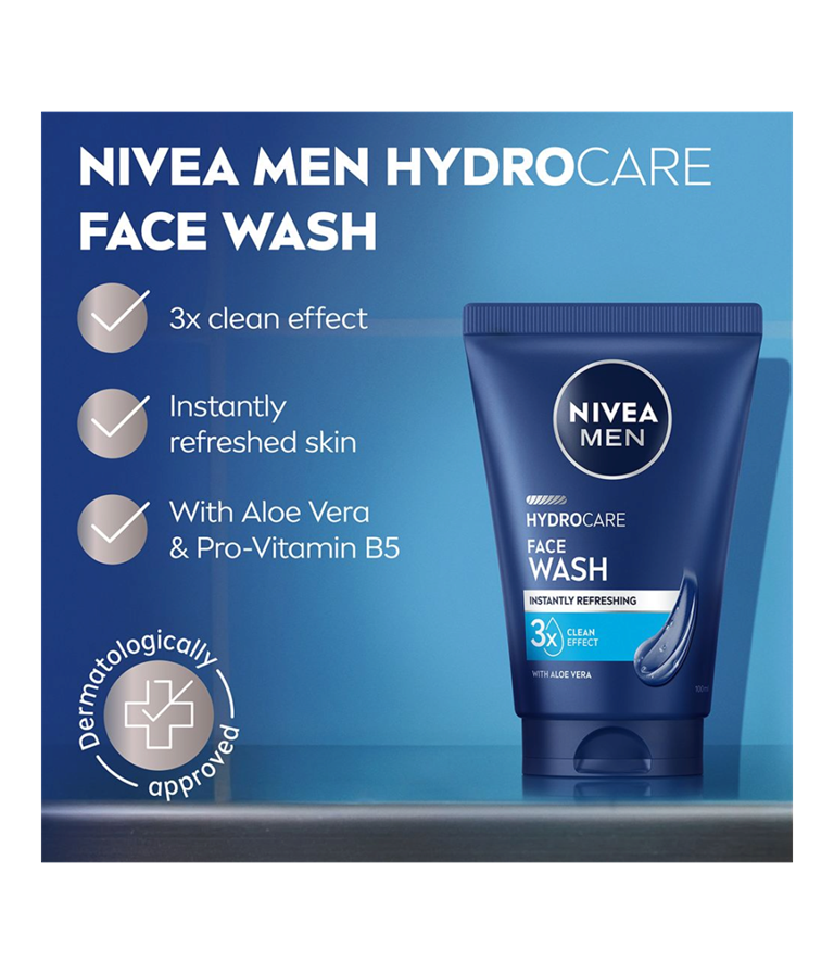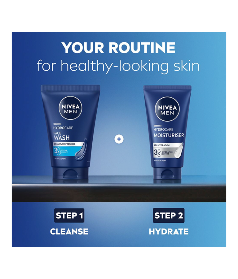Håll dig fräsch och återfuktad med NIVEA MEN Hydrocare Face Wash. Denna ansiktstvätt rengör din hud från svett, smuts och olja, samtidigt som den lämnar en återfuktand hudkänsla.