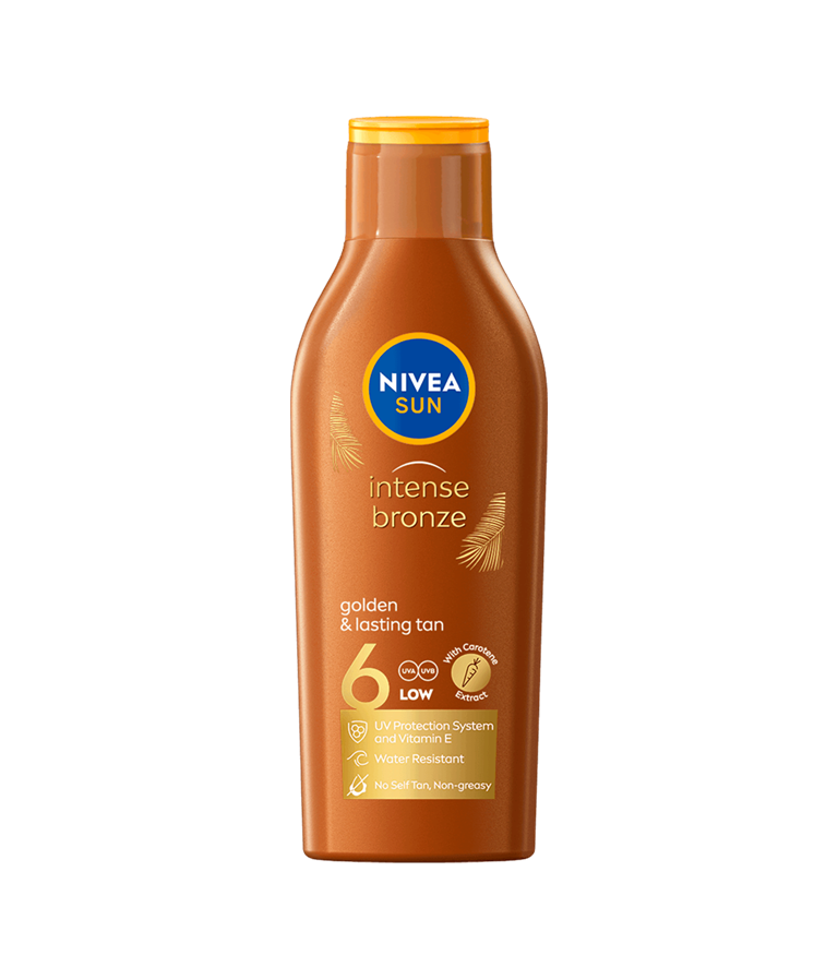NIVEA SUN Intense Bronze Sun Lotion SPF 6 är en solkräm som skyddar mot solbändhet med UVA och UVB skydd. Solskyddet ger en fin, naturlig gyllenbrun färg som varar länge, utan att innehålla brun utan sol.