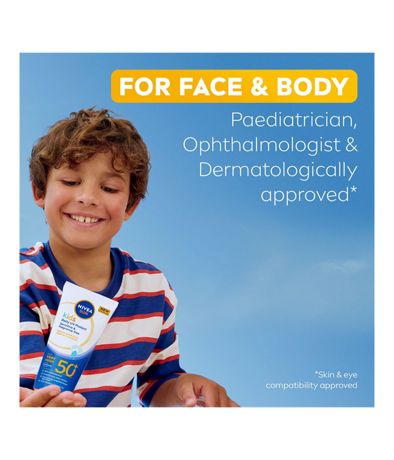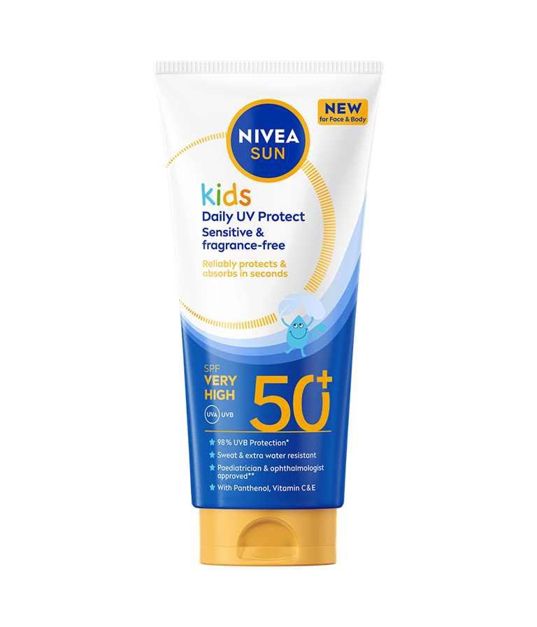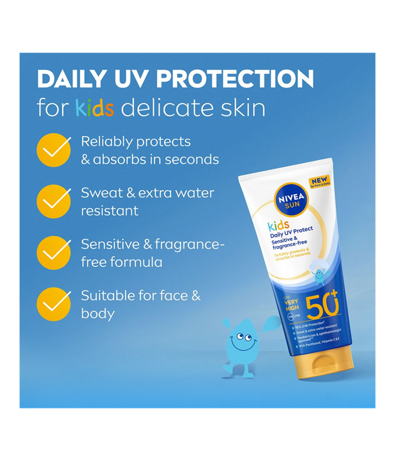 NIVEA SUN Kids Daily UV Protect SPF50+ är ett solskydd med mycket hög skyddsfaktor, särskilt utvecklat för barns känsliga hud. Krämen är helt fri från parfym, absorberas snabbt och lämnar huden mjuk utan att kladda. Den är både svett- och vattenresistent, vilket gör den perfekt för daglig användning.