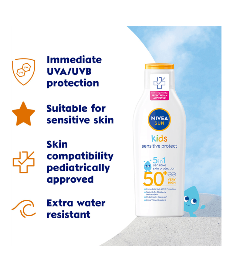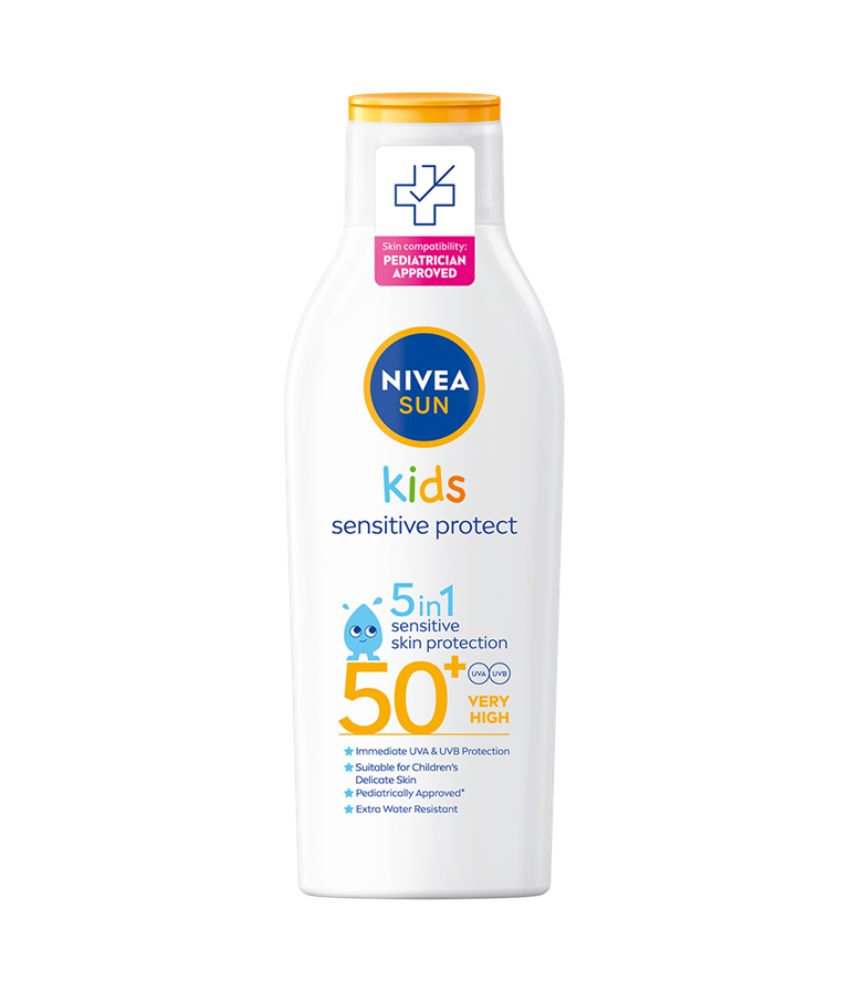 NIVEA SUN Kids Sensitive Protect & Play Sun Lotion SPF 50+ är en solskyddskräm för barns känsliga hud. Extra vattenresistent, parfymfri och ger omedelbart skydd mot UVA/UVB-strålar.