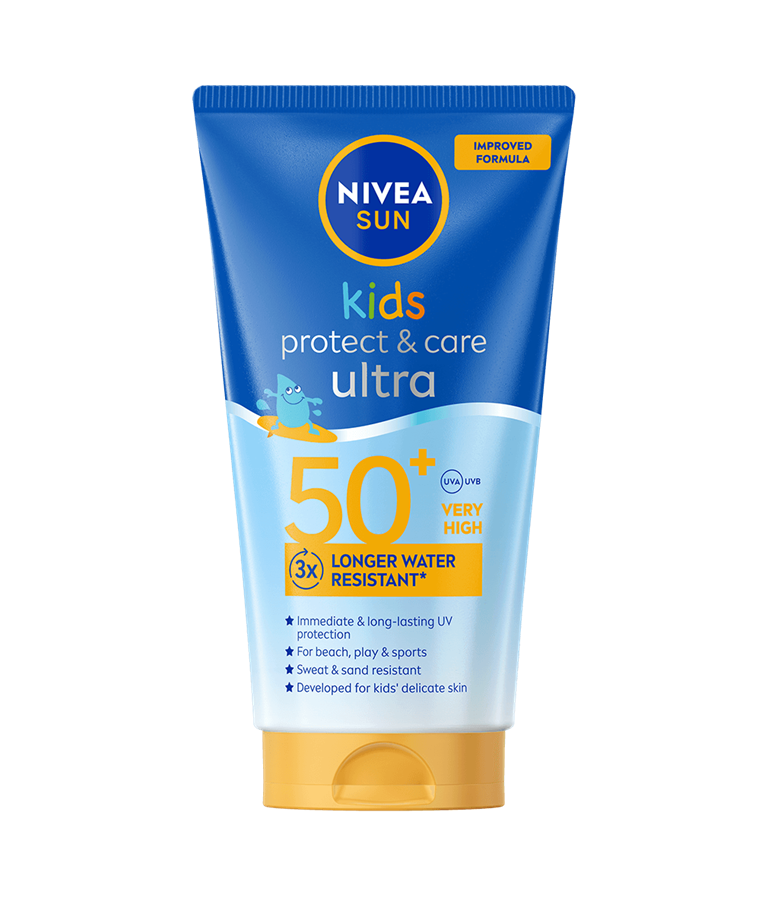 NIVEA SUN Kids Protect & Care Ultra Protect SPF 50+ är ett solskydd för barn med SPF 50+ som ger omedelbart och långvarigt skydd mot UVA och UVB-strålar. Dessutom har det 3x mer vattenresistens och är sandavvisande.