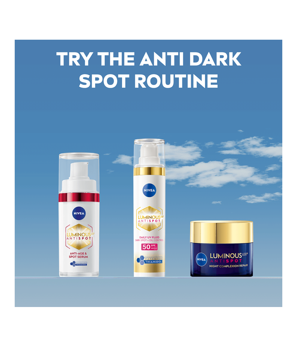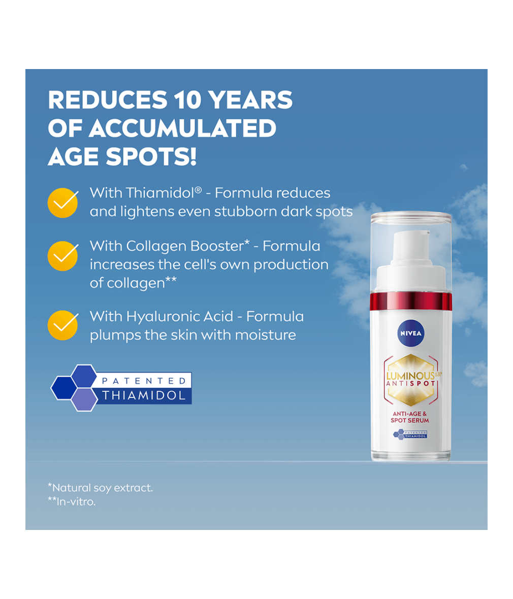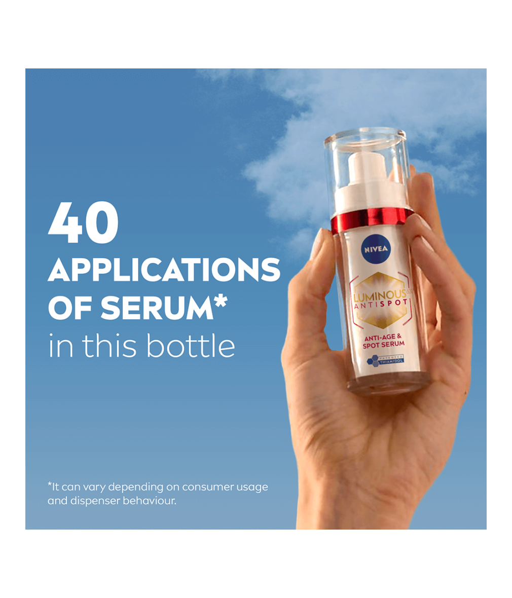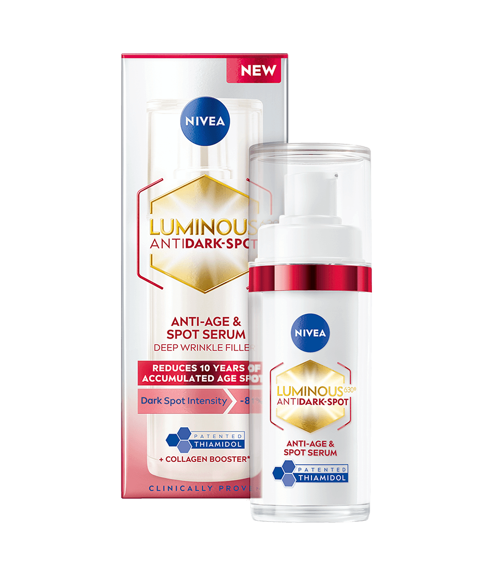 Reducera upp till 10 års ackumulerade ålderstecken med NIVEA Luminous630 Anti-Age & Spot Serum. Stärker hudens struktur och gör huden fastare. Fyller även djupa rynkor på 7 dagar.