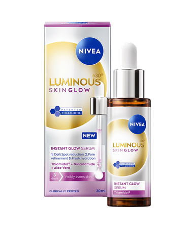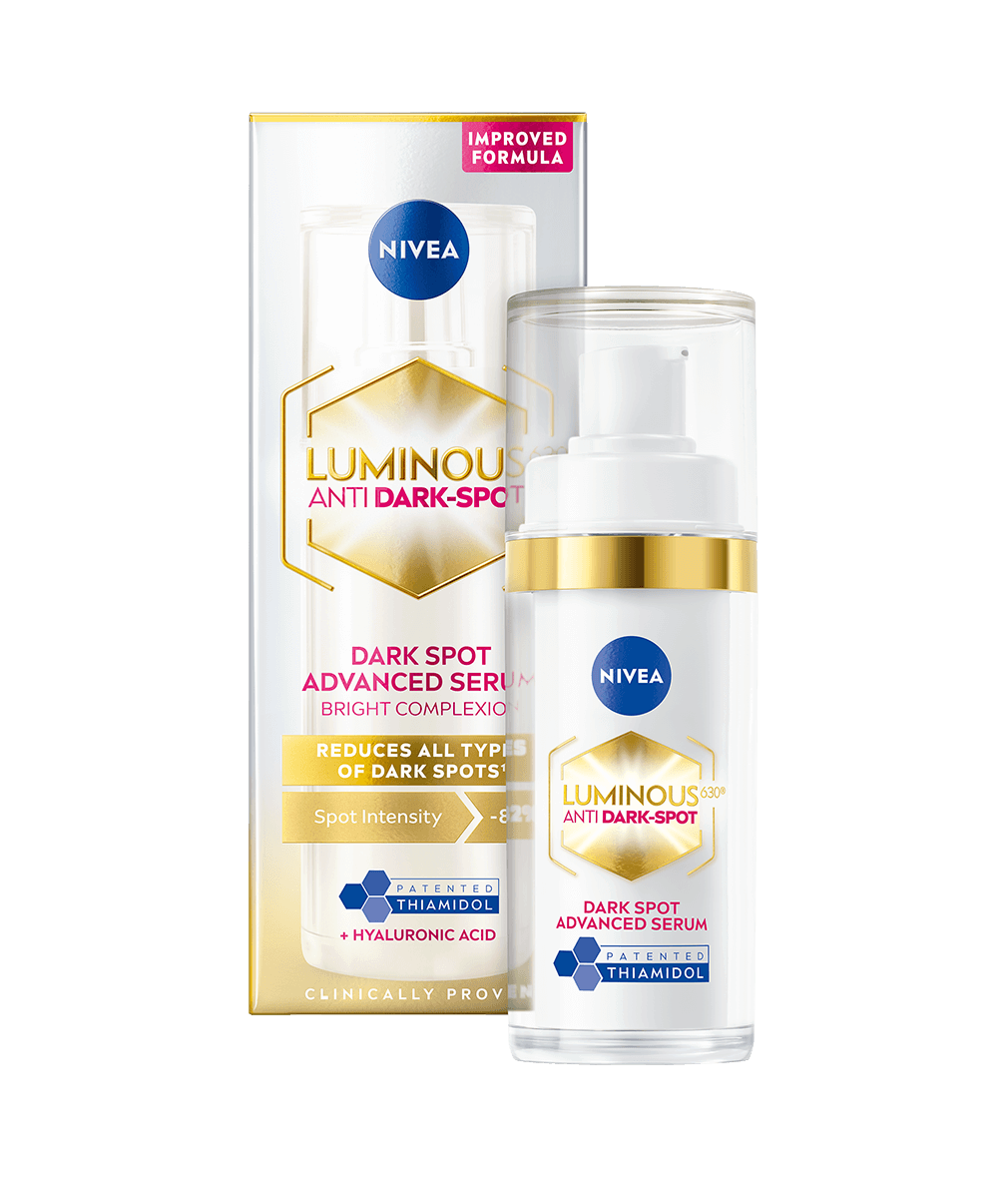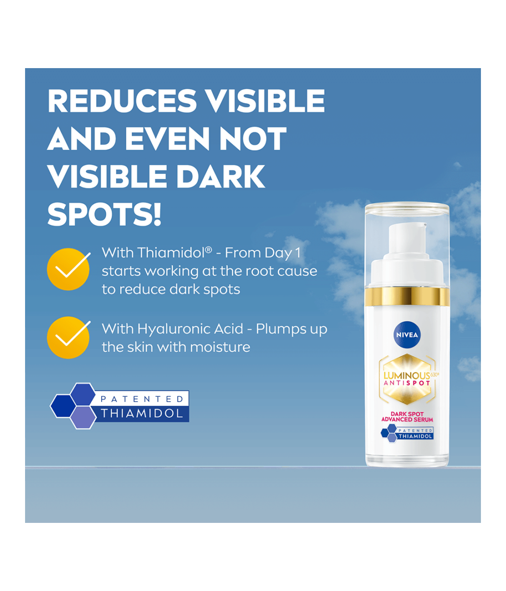 Vi har förbättrat vår ikoniska serumformel för att minska alla typer av mörka fläckar**, med första synliga resultat efter bara 7 dagar. NIVEA revolutionerade behandlingen av mörka fläckar efter 10 års noggrann forskning. Genom att testa 50 000 molekyler upptäckte vi vår patenterade ingrediens, THIAMIDOL. När THIAMIDOL testades mot det melaninsyntetiserande enzymet visade det sig vara den mest effektiva molekylen. THIAMIDOL ingår nu i vår LUMINOUS630® ANTI DARK-SPOT, där den balanserar pigmenteringen och minskar mörka fläckar. THIAMIDOLs dubbla effekt verkar på hudens egna processer för att: