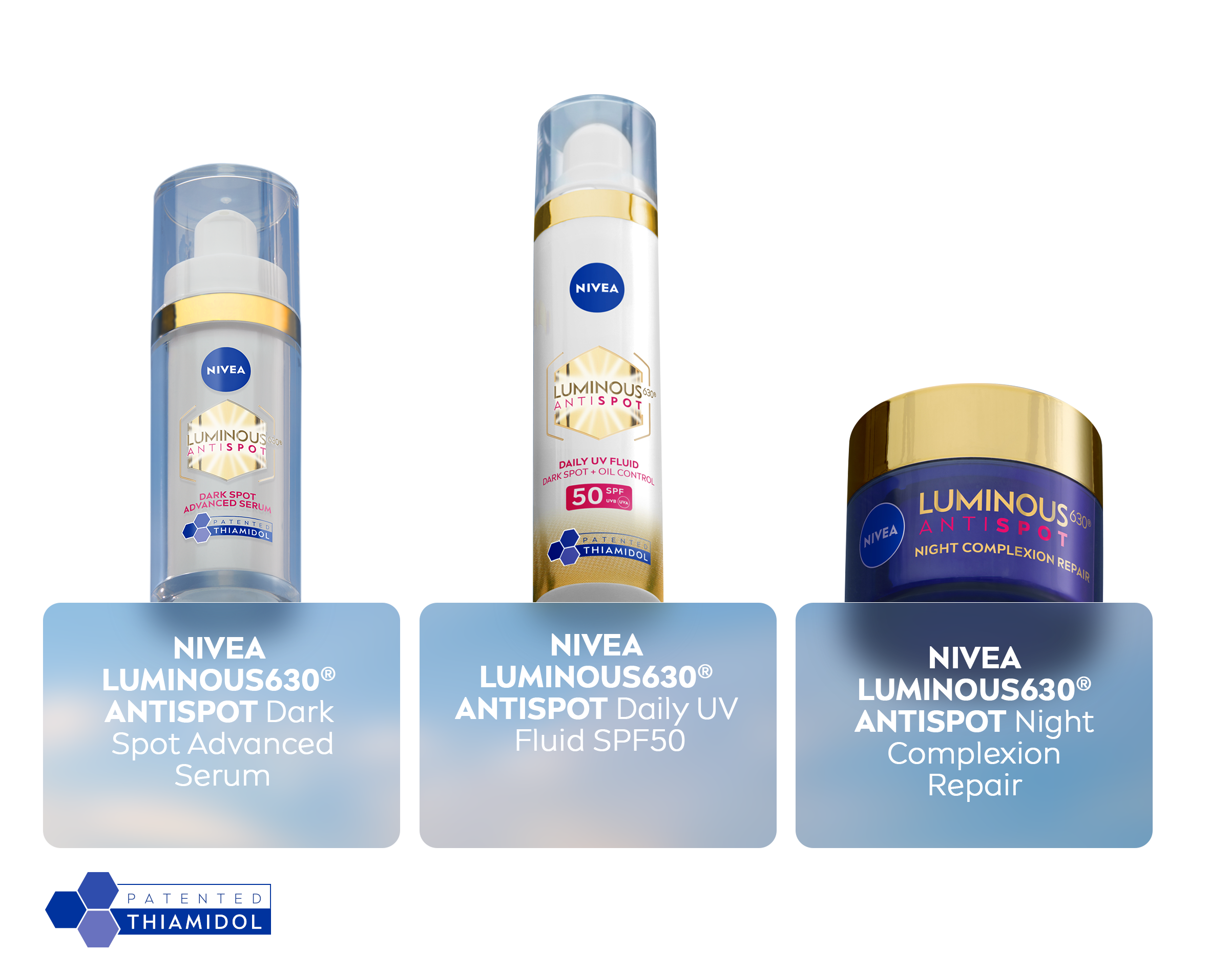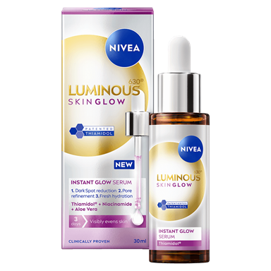 Vi har förbättrat vår ikoniska serumformel för att minska alla typer av mörka fläckar**, med första synliga resultat efter bara 7 dagar. NIVEA revolutionerade behandlingen av mörka fläckar efter 10 års noggrann forskning. Genom att testa 50 000 molekyler upptäckte vi vår patenterade ingrediens, THIAMIDOL. När THIAMIDOL testades mot det melaninsyntetiserande enzymet visade det sig vara den mest effektiva molekylen. THIAMIDOL ingår nu i vår LUMINOUS630® ANTI DARK-SPOT, där den balanserar pigmenteringen och minskar mörka fläckar. THIAMIDOLs dubbla effekt verkar på hudens egna processer för att: