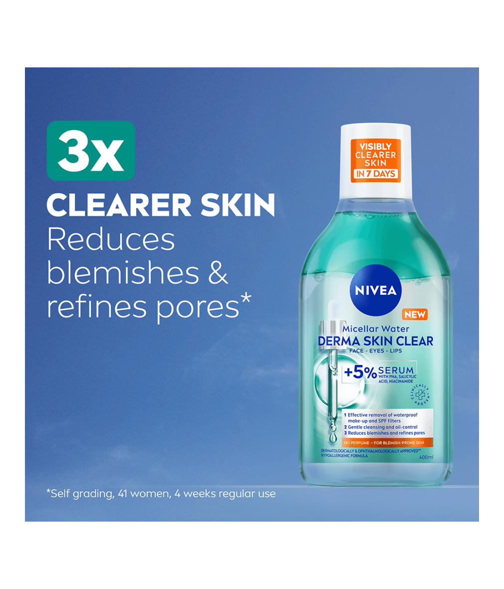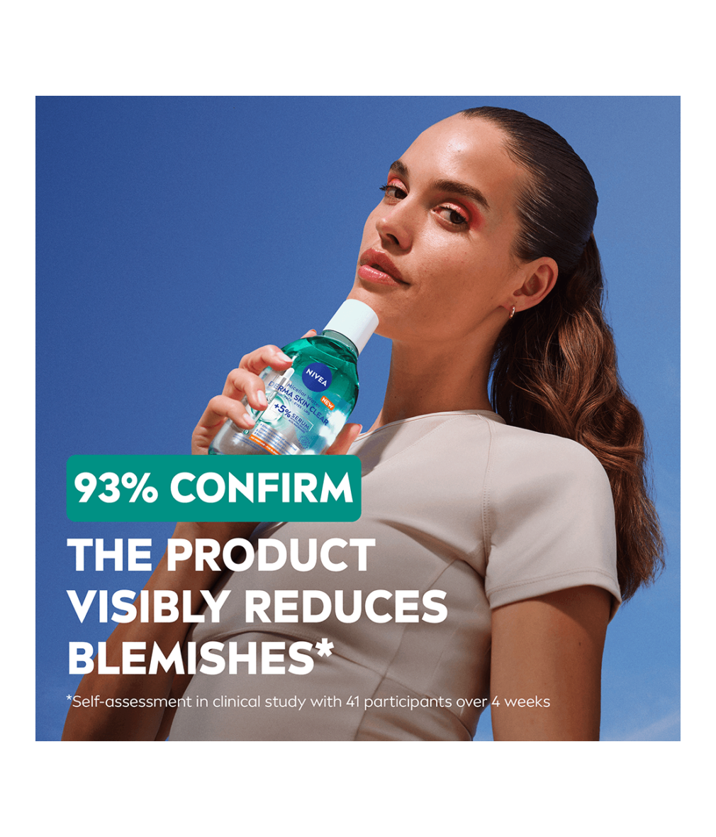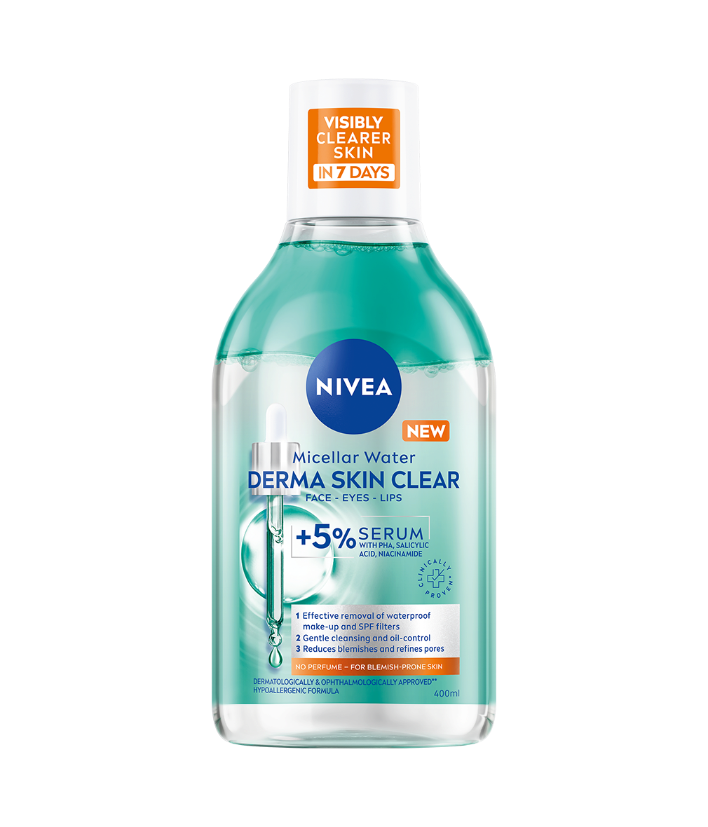 NIVEA Derma Skin Clear Micellar Water för aknebenägen hud är berikad med 5% serum med PHA, salicylsyra och niacinamid och tar effektivt bort vattenfast smink och SPF med bara några lätta svep. Den minskar finnar och förfinar porer för synligt förbättrad hud på 7 dagar.