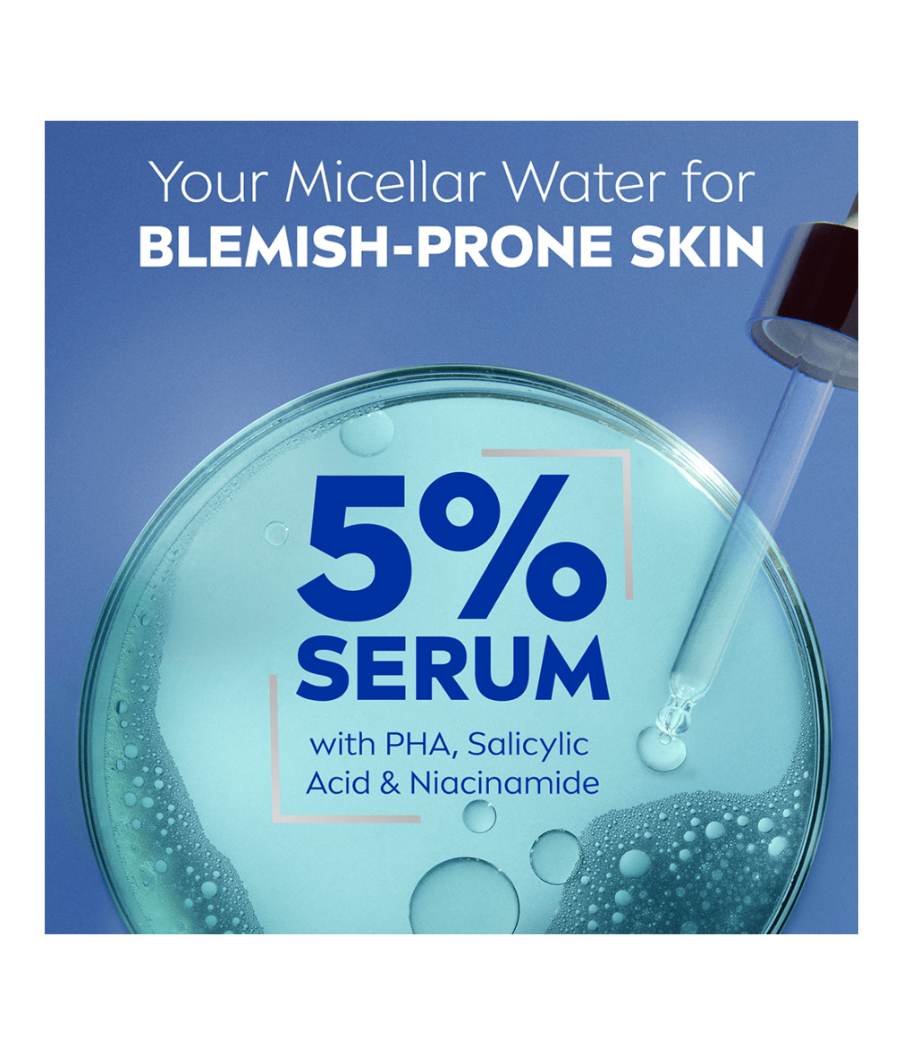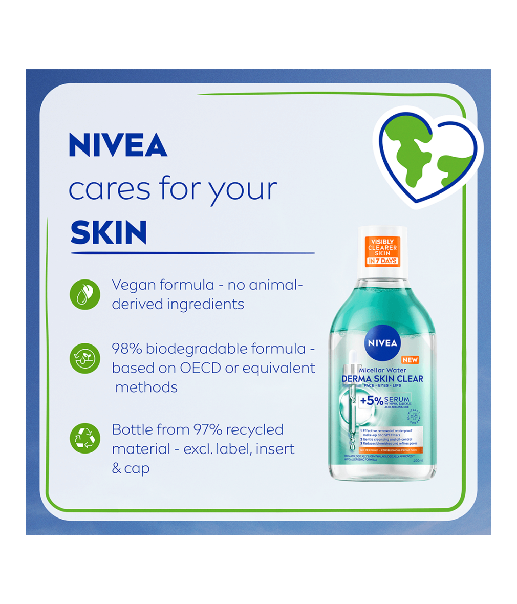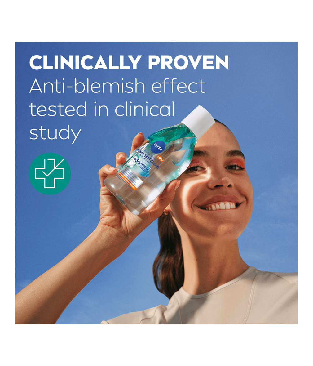 NIVEA Derma Skin Clear Micellar Water för aknebenägen hud är berikad med 5% serum med PHA, salicylsyra och niacinamid och tar effektivt bort vattenfast smink och SPF med bara några lätta svep. Den minskar finnar och förfinar porer för synligt förbättrad hud på 7 dagar.