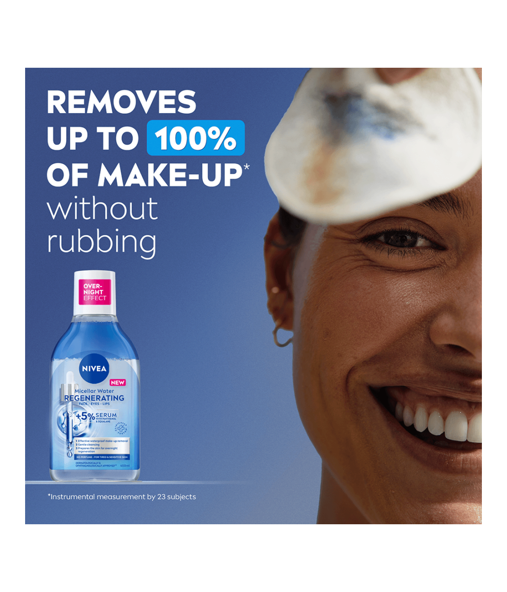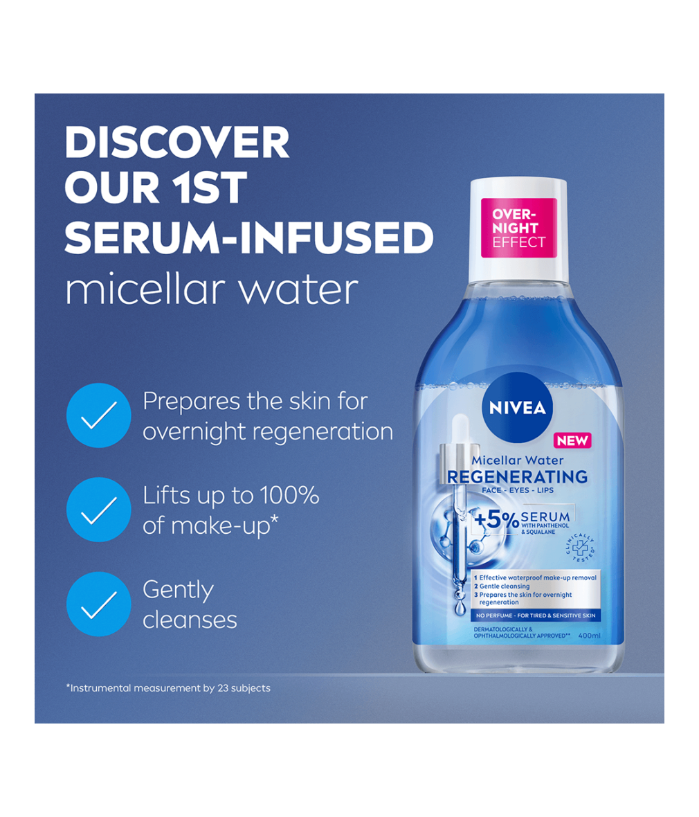 Micellar Water Regenerating är ett micellärvatten med +5% serum för trött och känslig hud som effektivt avlägsnar vattenfast smink, orenheter och smuts med endast några fjäderlätta svep. Den återställer fuktbalans och förnyelse av huden under natten, för en hud som ser utvilad ut på morgonen!