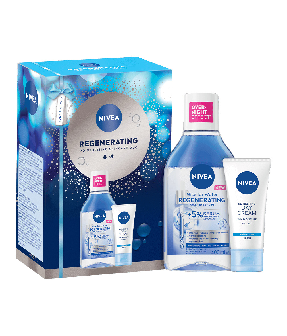 NIVEA Giftpack Regenerating är en perfekt present till någon du bryr dig om, eller varför inte unna dig själv? I denna presentbox hittar du: Micellar Water Regenerating - en mild rengöring som effektivt tar bort smink och orenheter, Refreshing Day Cream - en vårdande kräm som återfuktar huden, och NIVEA Soft – en fuktighetskräm för mjuk och smidig hud. Produkterna i detta paket är utvalda för att passa alla, vilket helt enkelt gör det till en perfekt present! Alla produkter är dermatologiskt testade. Glöm inte att du också kan återvinna alla produkter när de är slut, även kartongen de kom i!
