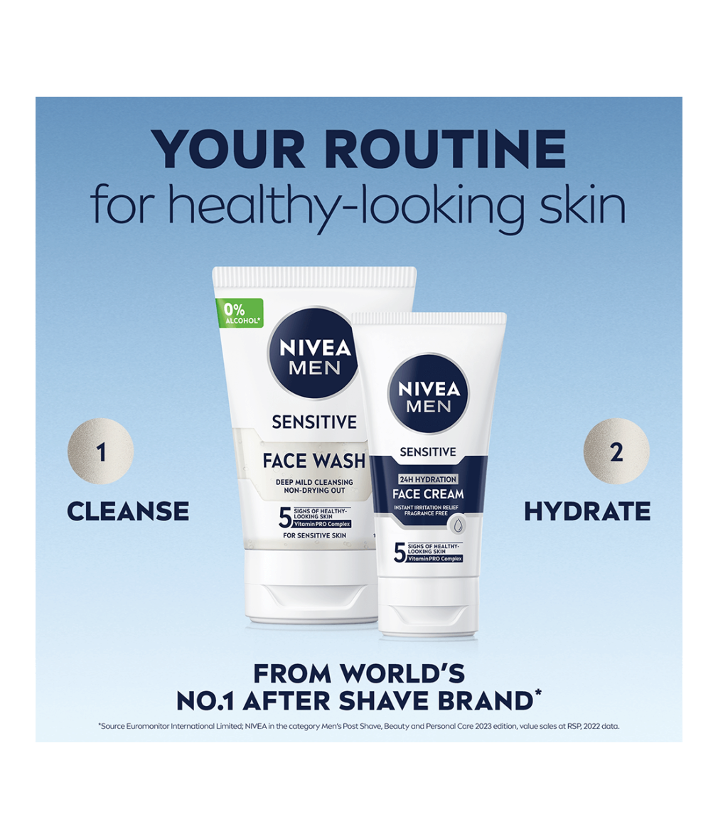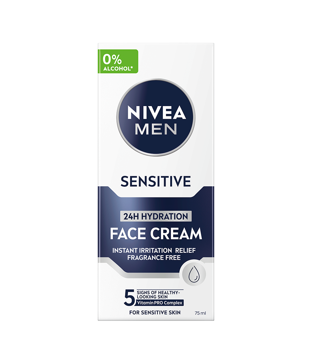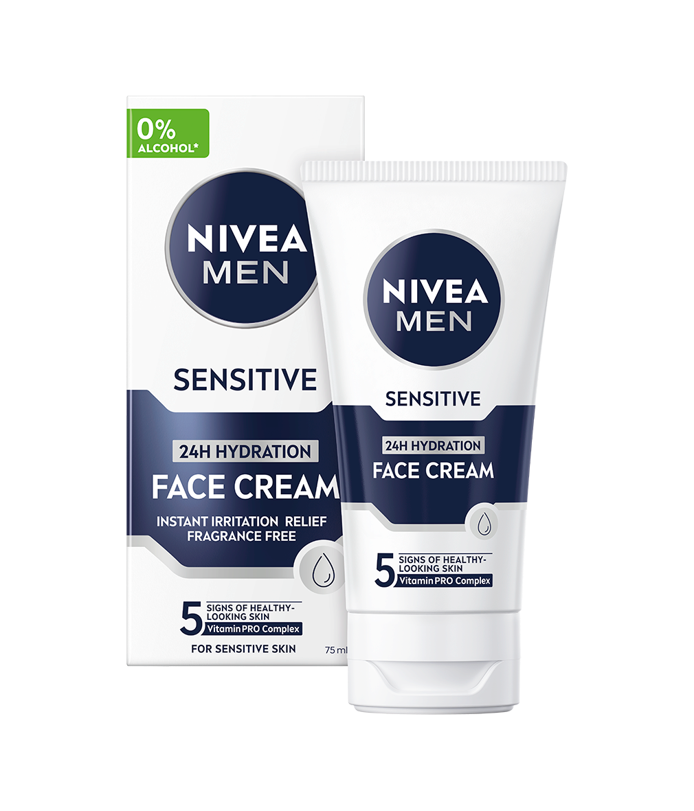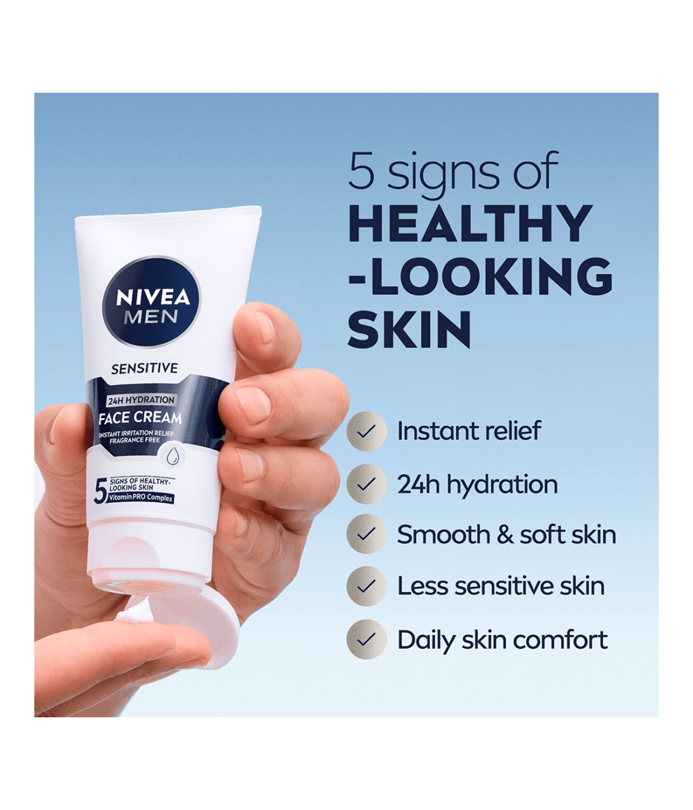 NIVEA MEN Sensitive Moisturiser Face Cream är en ansiktskräm med 24h återfuktning som är speciellt utformad för att ge långvarig fukt till känslig hud. Den lugnar och ger näring så att huden känns behaglig och fräsch hela dagen!