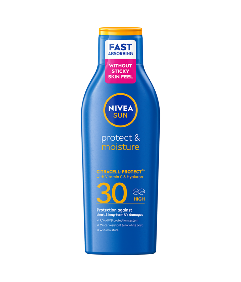 NIVEA SUN Protect & Moisture Sun Lotion SPF 30 ger ett omedelbart UVA- och UVB-skydd som stärker huden och minskar risken för solallergier. Den vårdande formulan är vattenresistent och håller dig återfuktad under sommarens varma dagar.