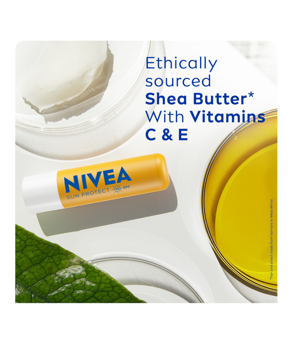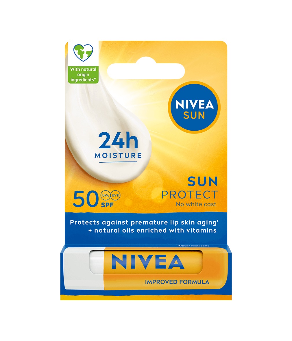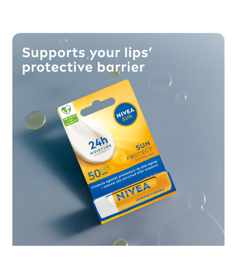NIVEA Sun Protect Lip Balm med SPF 50 skyddar intensivt dina läppar mot UVA/UVB-strålar samtidigt som formulan håller dina läppar återfuktade i 24 timmar!