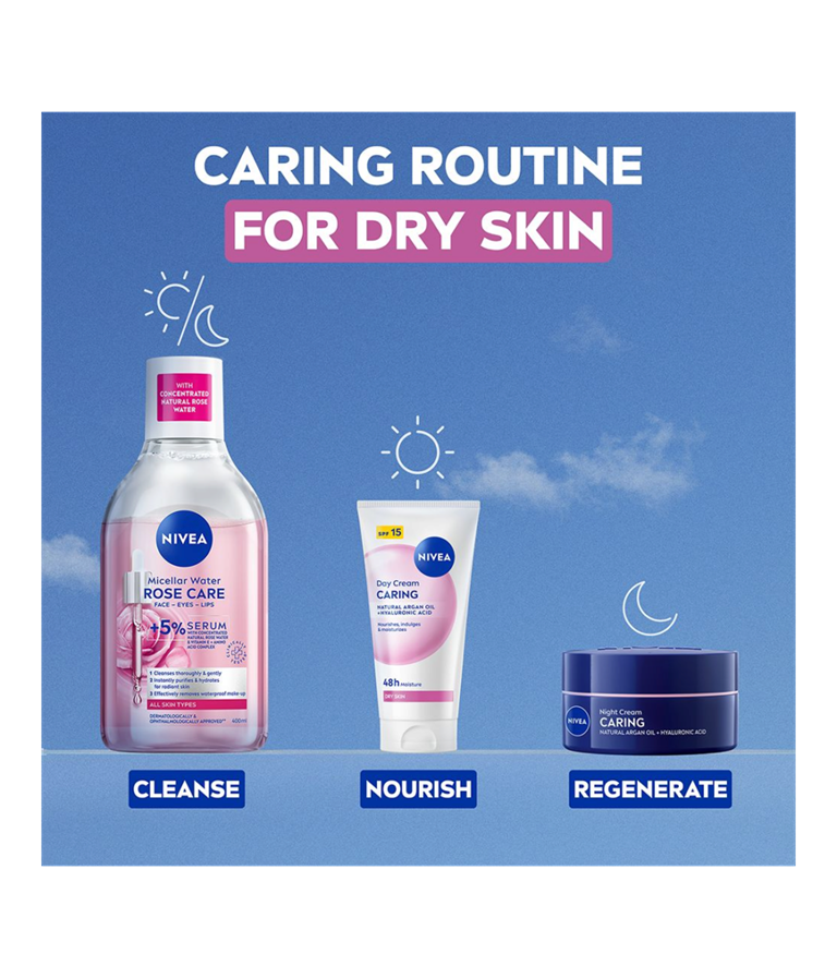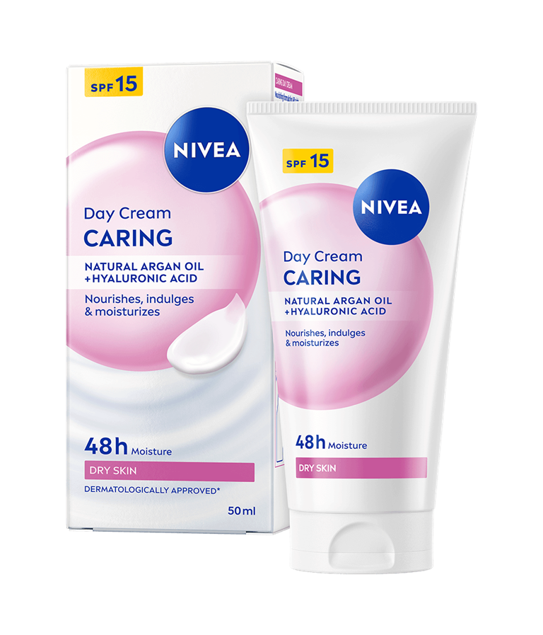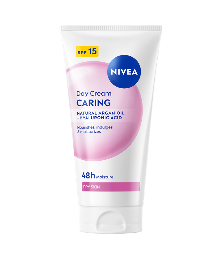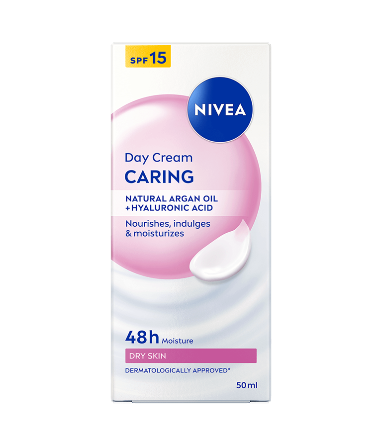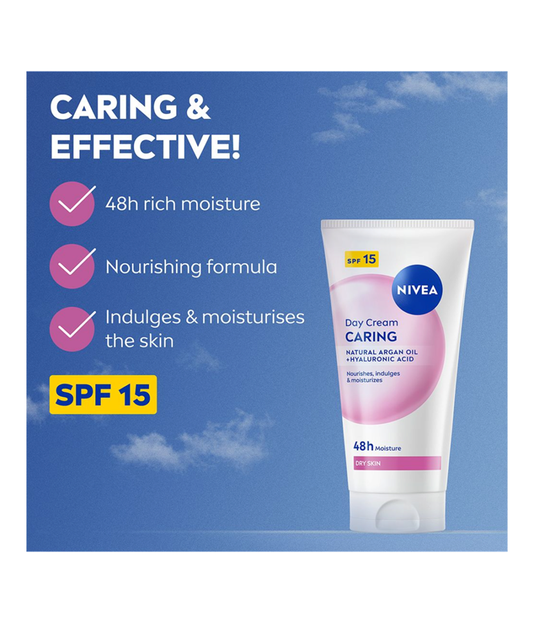 Caring Day Cream är en dagkräm speciellt anpassat för torr hud. Formulan med naturlig arganolja och hyaluronsyra ger huden djup återfuktning och näring samtidigt som den lämnar en mjuk känsla.