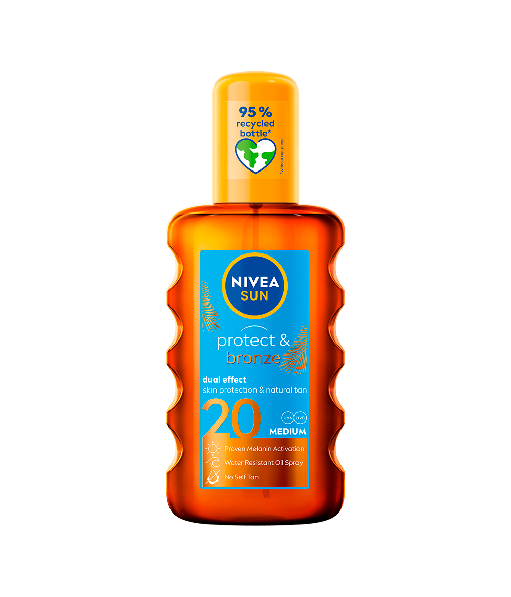 NIVEA SUN Protect & Bronze Oil Spray SPF 20 är solskyddet som ger en snygg och jämn bränna. Denna solspray har dubbel effekt: den skyddar huden mot UV-strålar + ger naturlig bränna genom bevisad melaninaktivering.