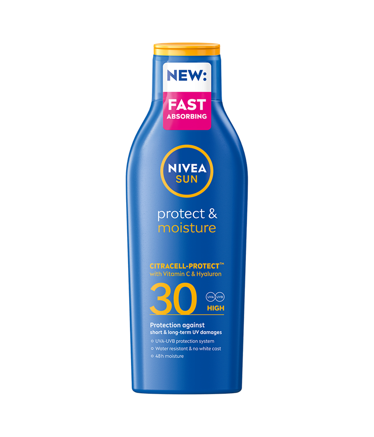 NIVEA SUN Protect & Moisture Sun Lotion SPF 30 ger ett omedelbart UVA- och UVB-skydd som stärker huden och minskar risken för solallergier. Den vårdande formulan är vattenresistent och håller dig återfuktad under sommarens varma dagar.
