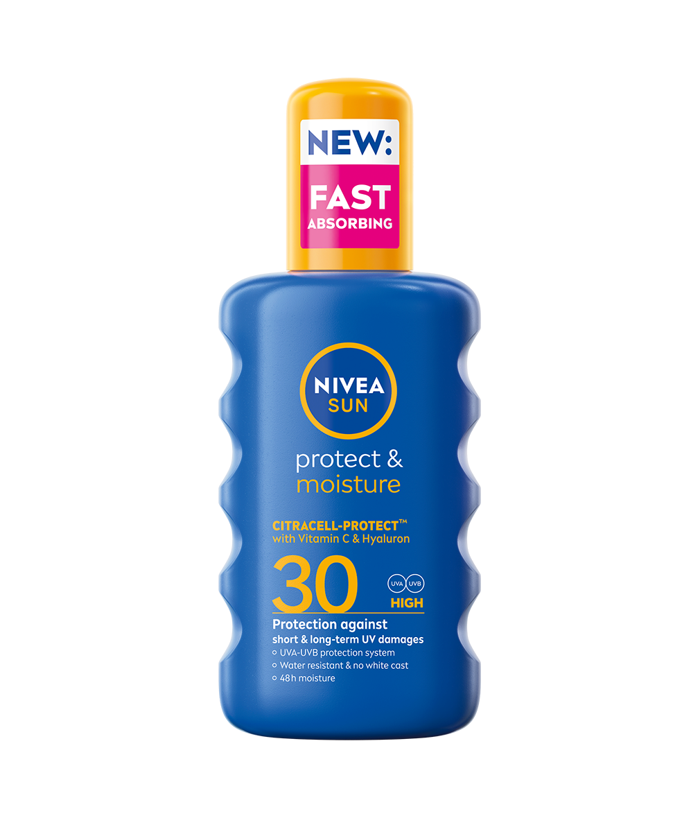 NIVEA SUN Protect & Moisture Sun Spray SPF 30 ger ett omedelbart UV-skydd och återfuktar huden på djupet. Med ett formula som minskar risken för solallergi skyddas du både från kort- och långsiktiga UV-skador.