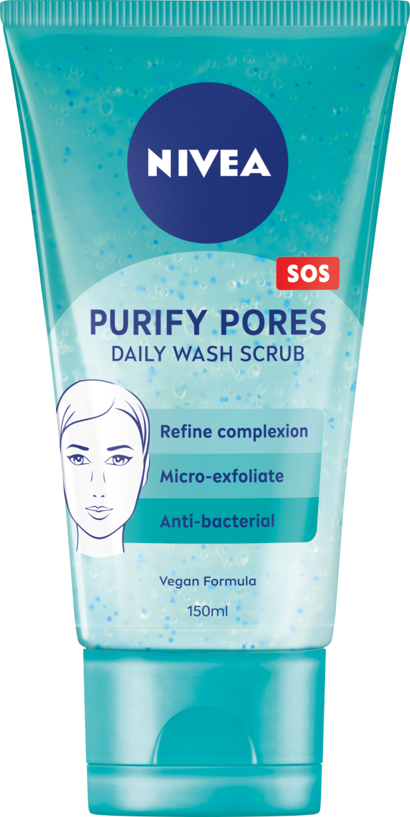 NIVEA Purify Pores Daily Wash Scrub är en ansiktsskrubb för blemmande hud som hjälper till att förfina din hud och förebygga förebygga finnar och blemmor. Den antibakteriella formulan rengör effektivt.
