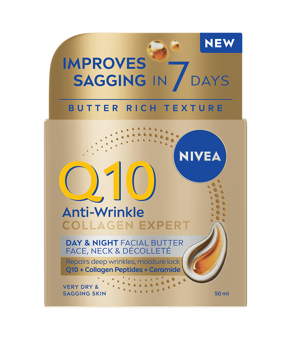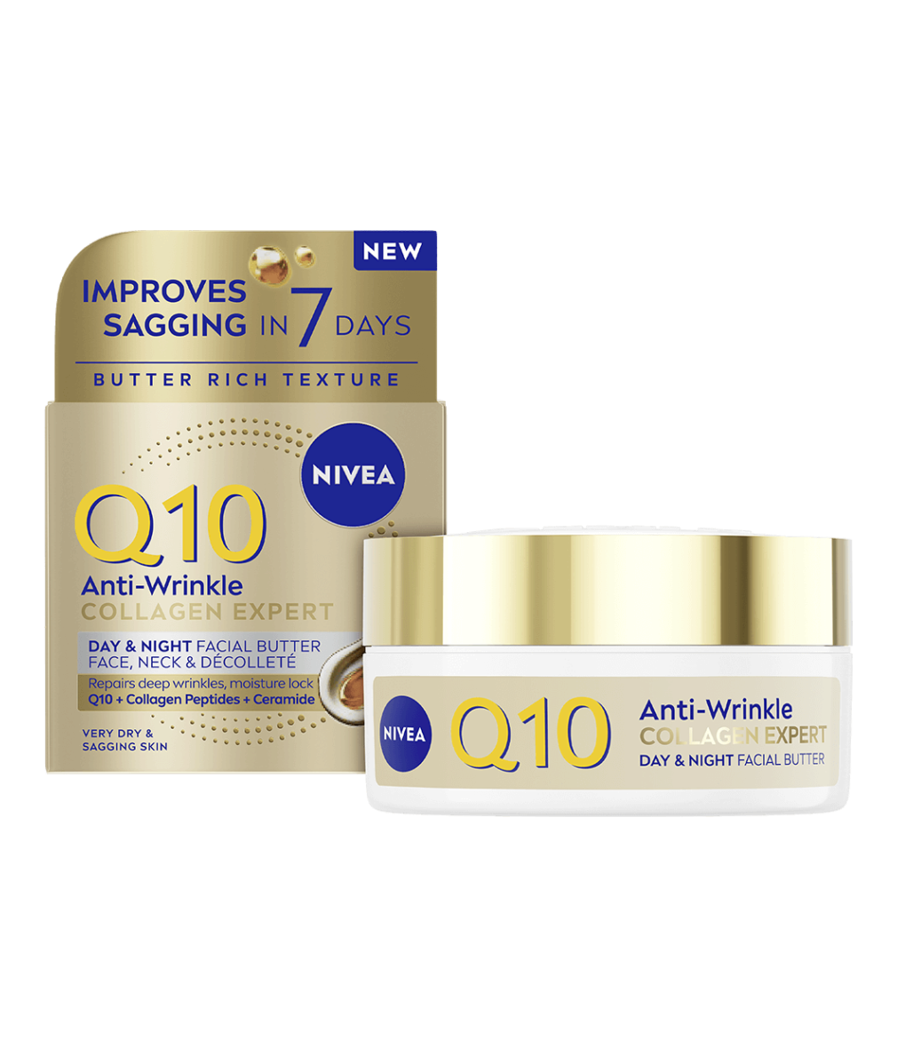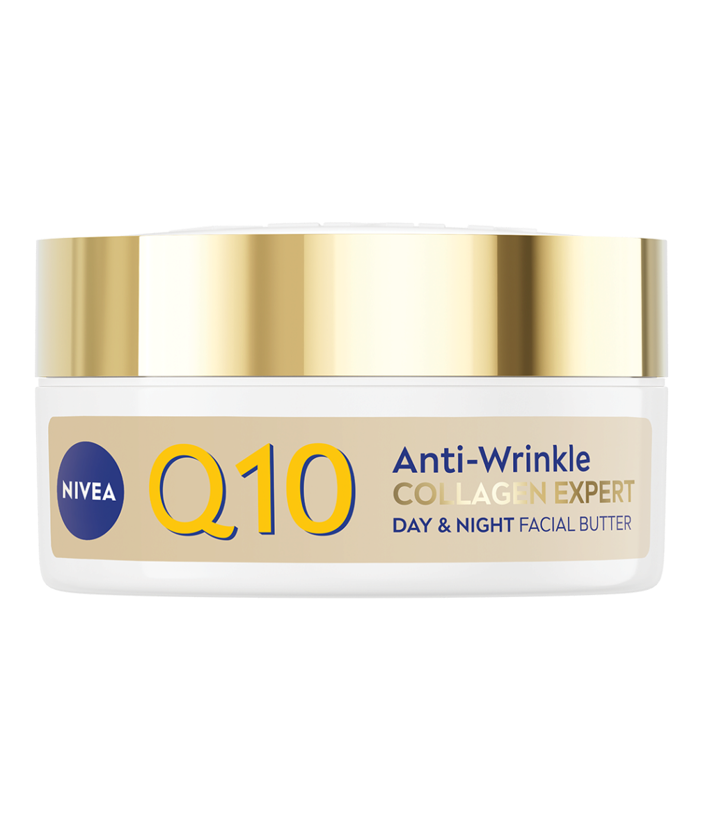 NIVEA Q10 Anti-Wrinkle Collagen Expert Day & Night Facial Butter är en rik och smörig ansiktskräm som återfuktar huden på djupet och stärker fuktbarriären. Innehåller ren Q10, kollagenpeptider och ceramider för att minska rynkor och förbättra elasticiteten.