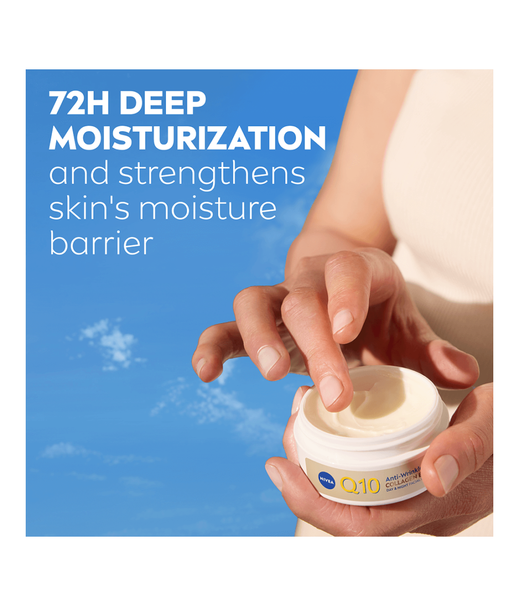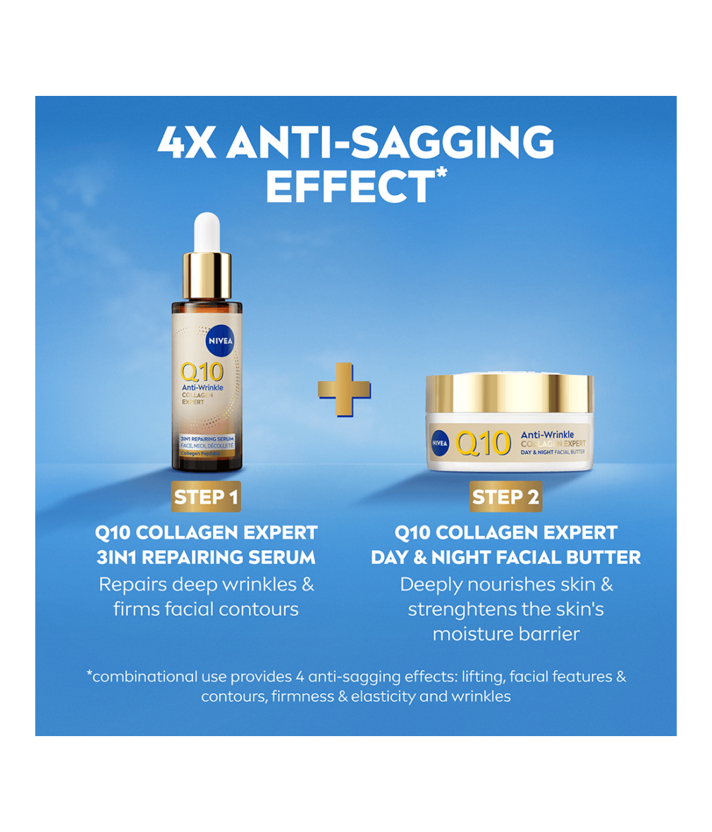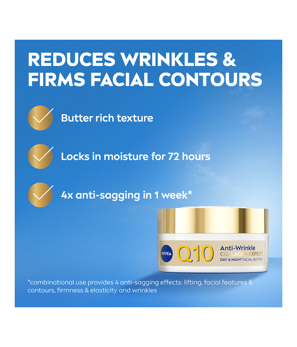 NIVEA Q10 Anti-Wrinkle Collagen Expert Day & Night Facial Butter är en rik och smörig ansiktskräm som återfuktar huden på djupet och stärker fuktbarriären. Innehåller ren Q10, kollagenpeptider och ceramider för att minska rynkor och förbättra elasticiteten.