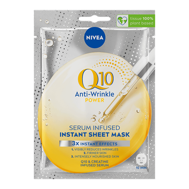 NIVEA Q10 Anti-Wrinkle Energy Sheet Mask är en ansiktsmask som återfuktar huden omedelbart och reducerar tecken på trötthet. Formulan med Q10 och Vitamin C har tre omedelbara effekter: återupplivar trött hud, vårdar huden och reducerar fina linjer.