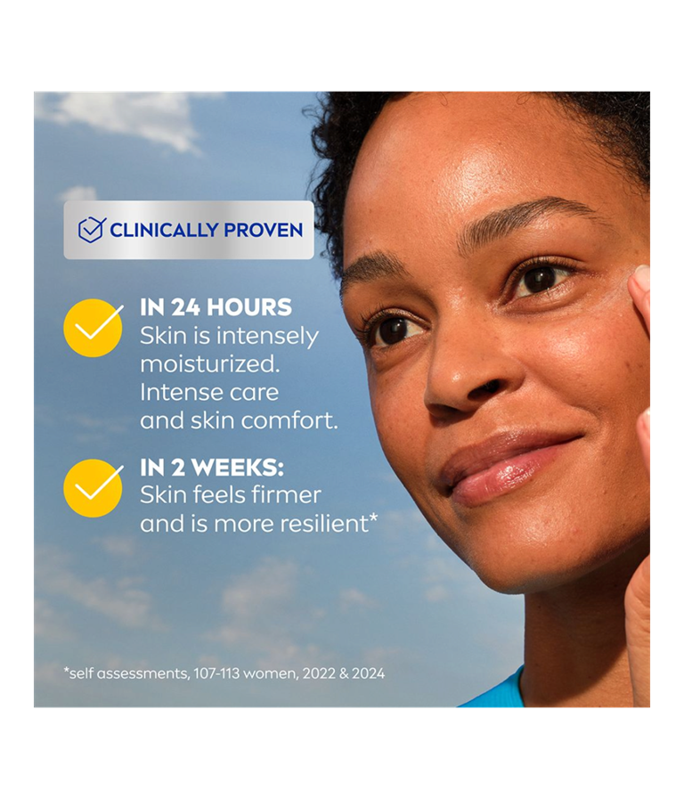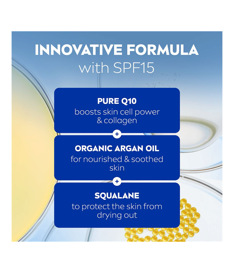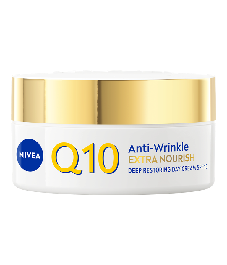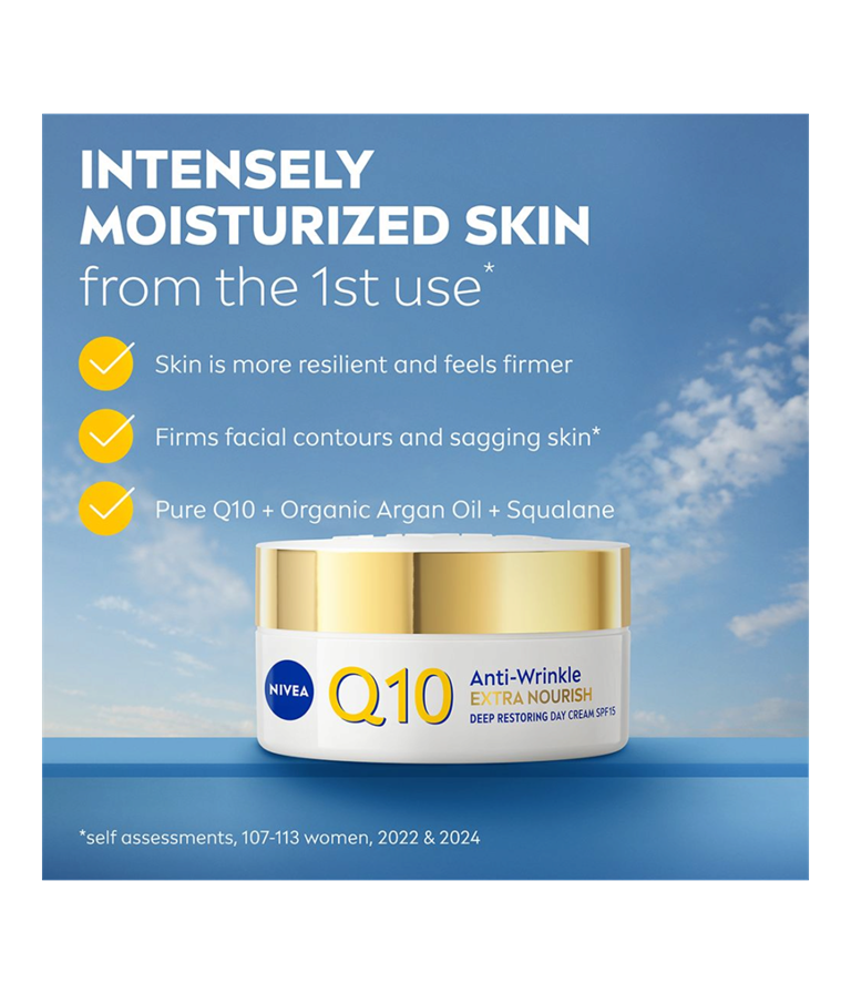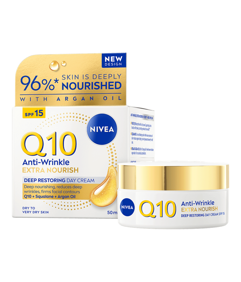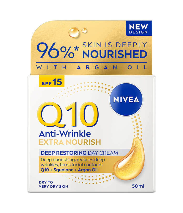 NIVEA Q10 Anti-Wrinkle Extra Nourish Day Cream, berikad med Q10, squalane och arganolja, är speciellt framtagen för att möta behoven hos torr till mycket torr hud. Denna dagkräm ger intensiv återfuktning i upp till 24 timmar, fastare hud efter 2 veckor, och minskar synligt djupa rynkor efter 4 veckor.