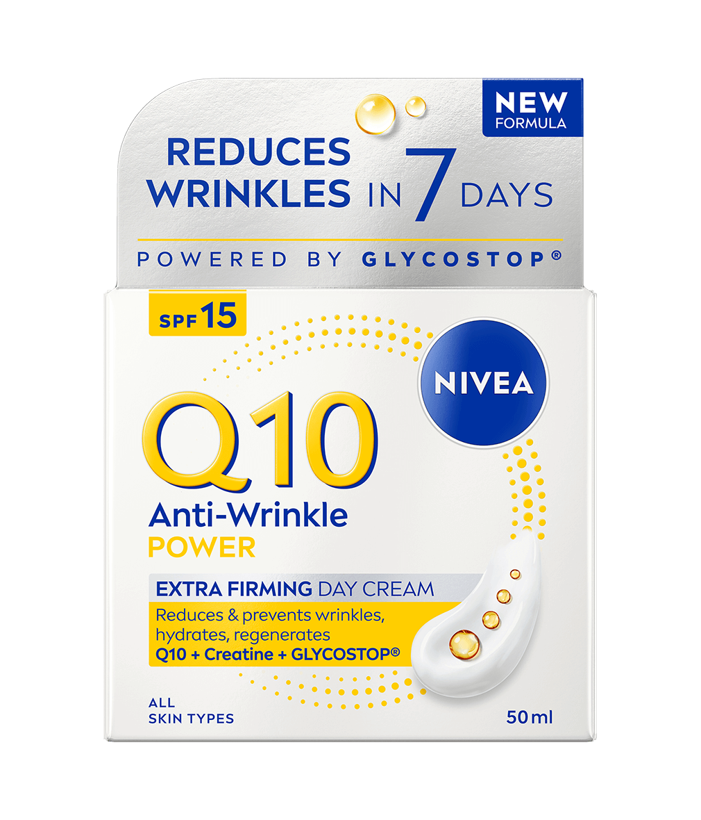 NIVEA Q10 Anti-Wrinkle Power Extra Firming Day Cream med SPF15 är en dagkräm som intensivt vårdar och återfuktar huden samt reducerar rynkor, för en mjuk hudkänsla och fastare hud. Innehåller dubbel kollagen-booster med ren Q10 och Kreatin, Glycostop, samt Hyaluronsyra.