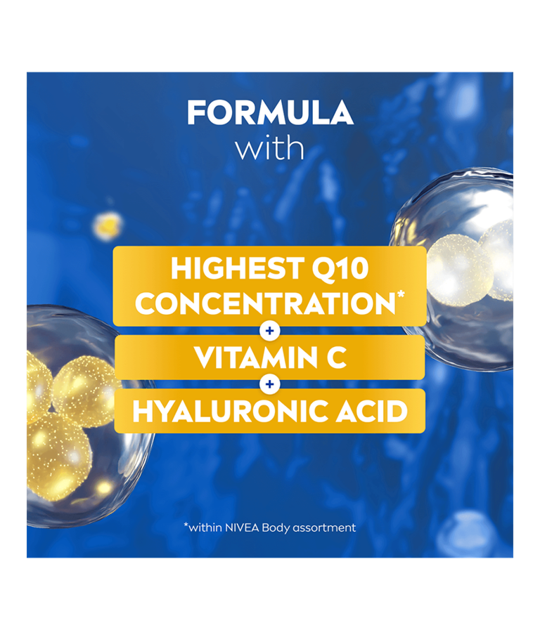 NYA NIVEA Q10 Firming Energizing body serum-Lotion med vår högsta koncentration av ren Q10*, Vitamin C och Hyaluronsyra gör huden fastare på bara 7 dagar och ger omedelbart en energigivande känsla i huden. *Inom NIVEA Body-sortimentet.